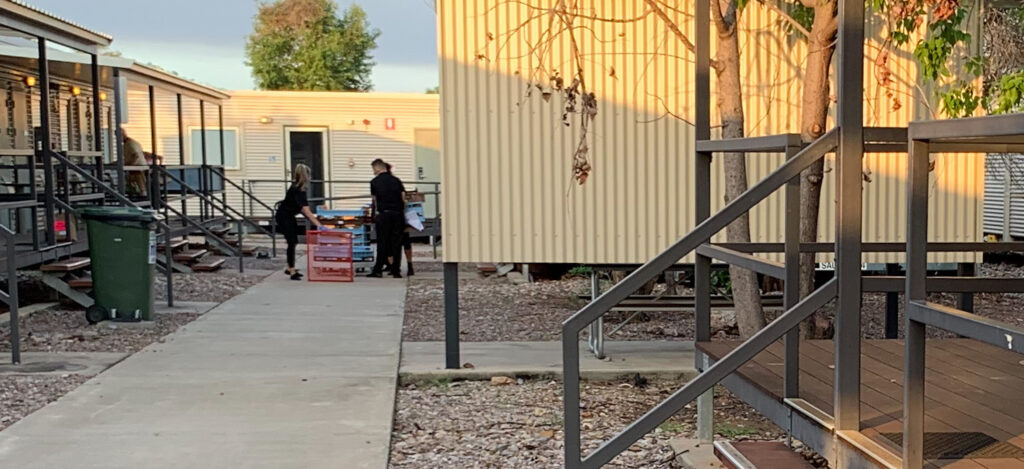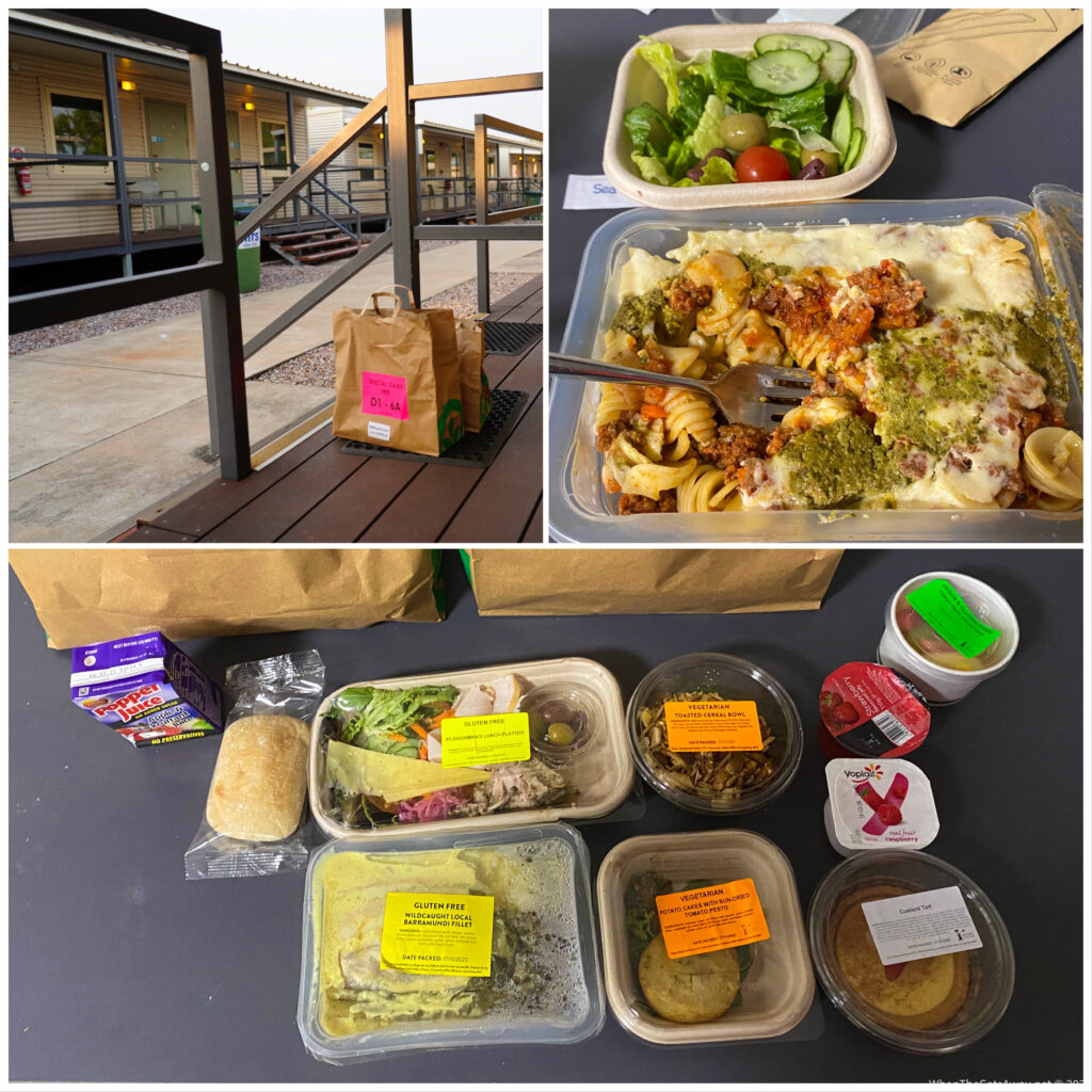 Mealtimes and food: 24-hours worth of food is delivered in bags at around 6pm – that is a hot meal for the evening, breakfast and lunch for the following day. The food here is not too bad considering they are catering for around 1,000 people, workers included. They manage quite well with dietary needs (I am dairy-free), though the food choices are not necessarily what I would eat. Monday night is chicken parmigiana for the ‘normal’ people, so I get the vegan version – polenta with vegan cheese. I have honestly never eaten anything so unpleasant! The lunches are usually some kind of salad, and unfortunately the leaves do not survive the night, and by the following day are limp and unappetising. Thursday night is chicken and prawn laksa night – everyone’s favourite!