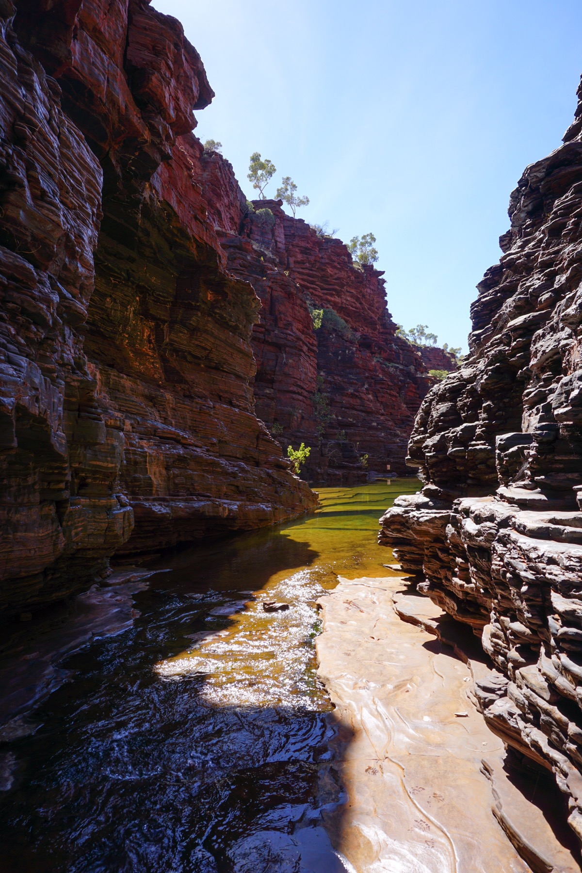 A pleasant day spent wandering around more gorges. A short drive took us to a lookout (Oxer) with a commanding view over several of the gorges we were planning to clamber down into. It looked a long way down, but the first hike in was a relatively easy scramble down the red rocky path. This was Weano Gorge, where briefly we were alone – around 10 treasured minutes I think. The silence was wonderful. Alas, soon we were with the hordes again. My only explanation is that the areas we have been visiting so far in WA contain very few roads, and limited places you can actually access and walk, so everyone is funnelled to the same places. Also, NSW, Victoria and the central and southern parts of WA are all relatively cold currently, so every tourist and grey nomad in Australia has only three choices during our winter if they want the sun (and who doesn’t!) – Queensland, northern WA, or the Northern Territory. Anyway I digress.