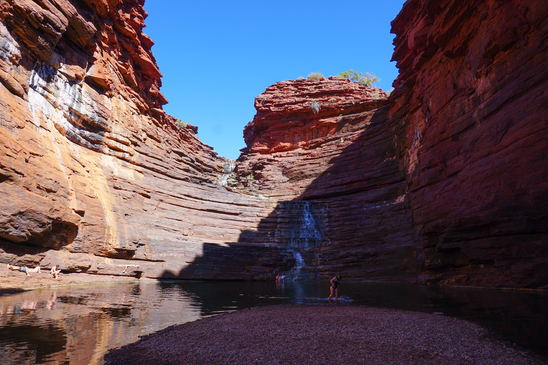 The next stage was boots off time and wading through icy cold water across a pebbly creek bed. I was persuaded against my better judgement by my lovely (younger) wife. The final leg would have involved gripping onto a ledge and sliding along the side of the cliff. No thanks… Ah well..getting old I suppose. A stiff climb out and we were done walking for the day. Time for an iced mocha at the Karijini Eco Retreat. Quite civilised really.