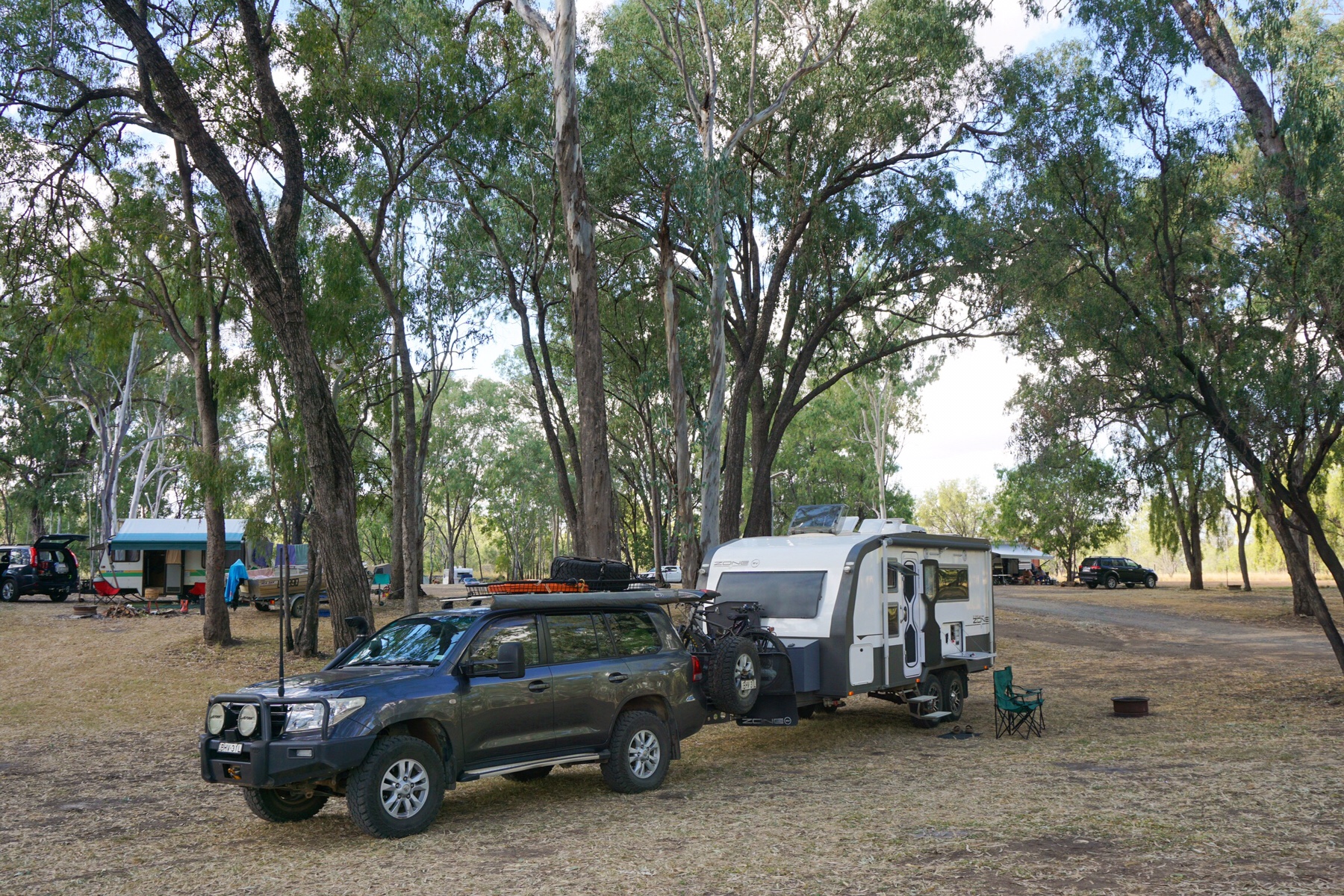 The owner of aforementioned dogs came over to apologise and explain that his fur children lived with cats and were not threatening Tassie, just saying hello. They were holidaying at this spot for 10 days. One night was more than enough for us – while at face value the riverside camp looked pretty enough, the road trains thundering just metres away along the highway from 4am onwards were not ideal.