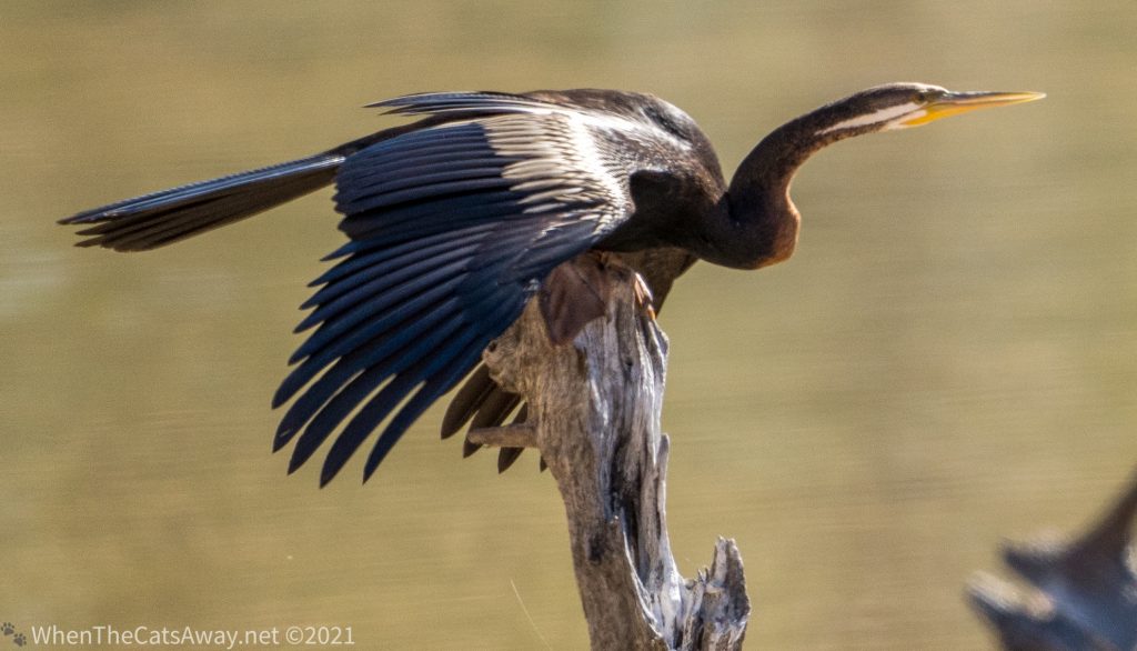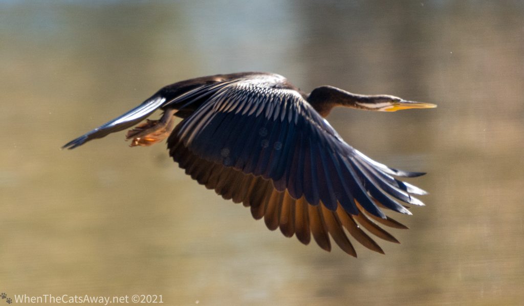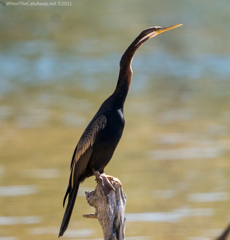 An Australian Darter sits on the shore drying off after its latest fishing expeditionIt decides it is time to head back out for more food….preparing to take offAnd away it goes – just look at those gorgeous wings. From afar, these beauties just look black.