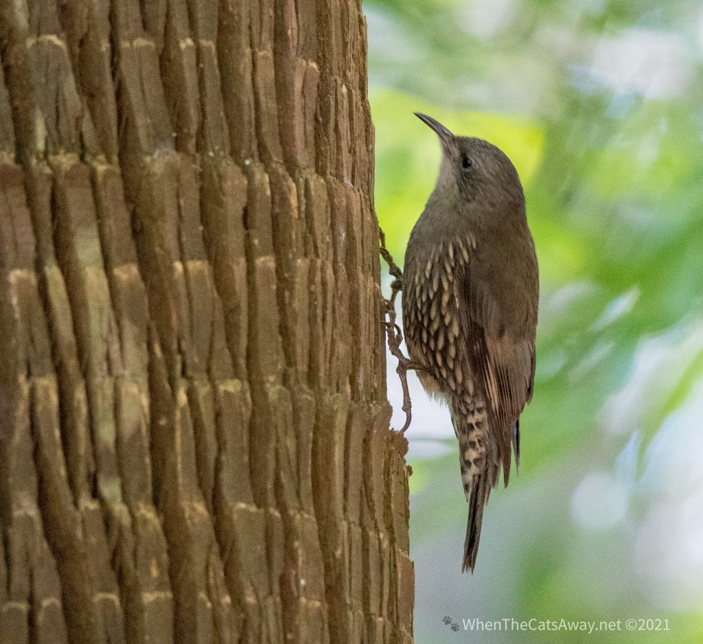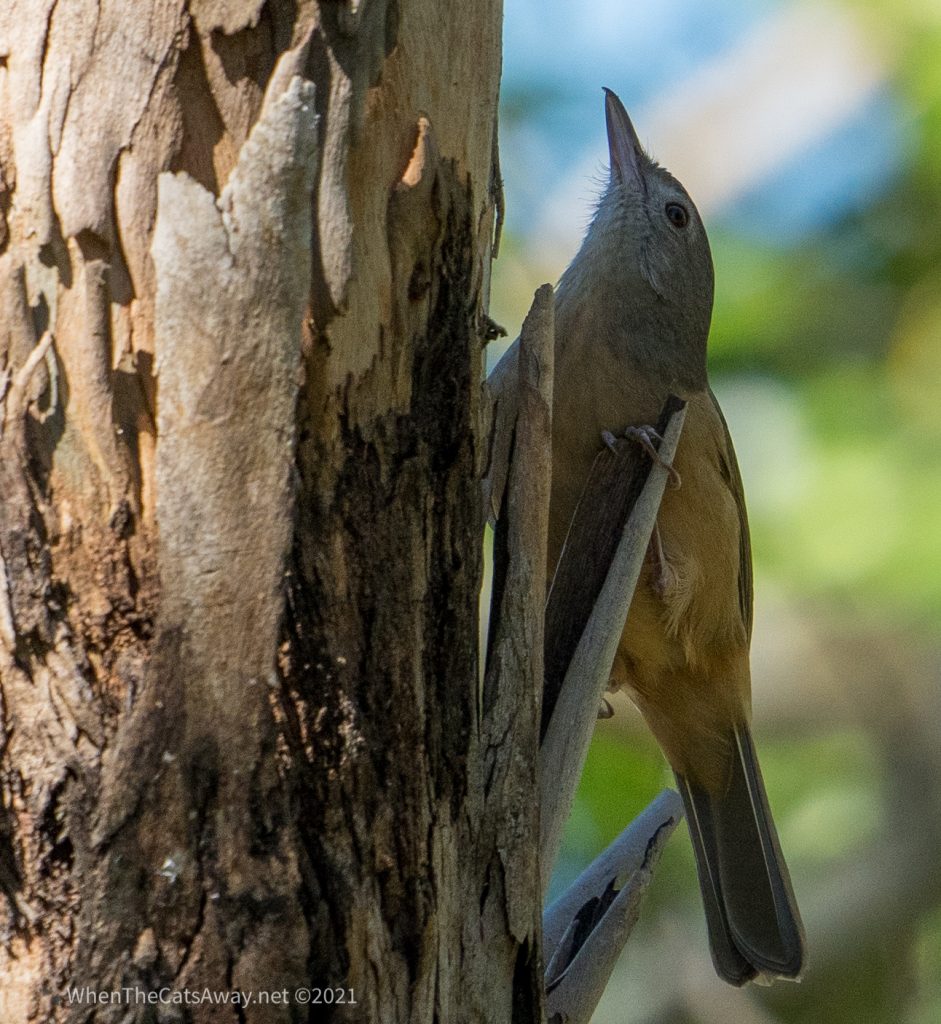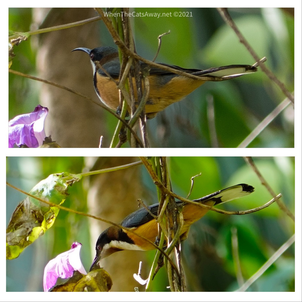 An Eastern Spinebill drinks the nectar from a Morning Glory flower – a pest weed in some of these partsA White-throated Treecreeper appeared on a tree just in front of us and climbed the trunk with its huge feet, hunting for insectsA Little Shrikethrush – another bird that loves hunting for insects, thinking nothing of ripping off bark in its questNo insect is safe from this Little Shrikethrush