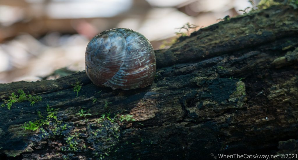 Beautiful waters of Crediton CreekEpiphytes (parasitic plants) growing on treesA Giant Panda Snail shell – these are the size of golf balls – the largest snail in Australia and a favourite of many birds in the rainforestA fabulous array of greens along our pathwayWindows through the trees frame vistas of the creek