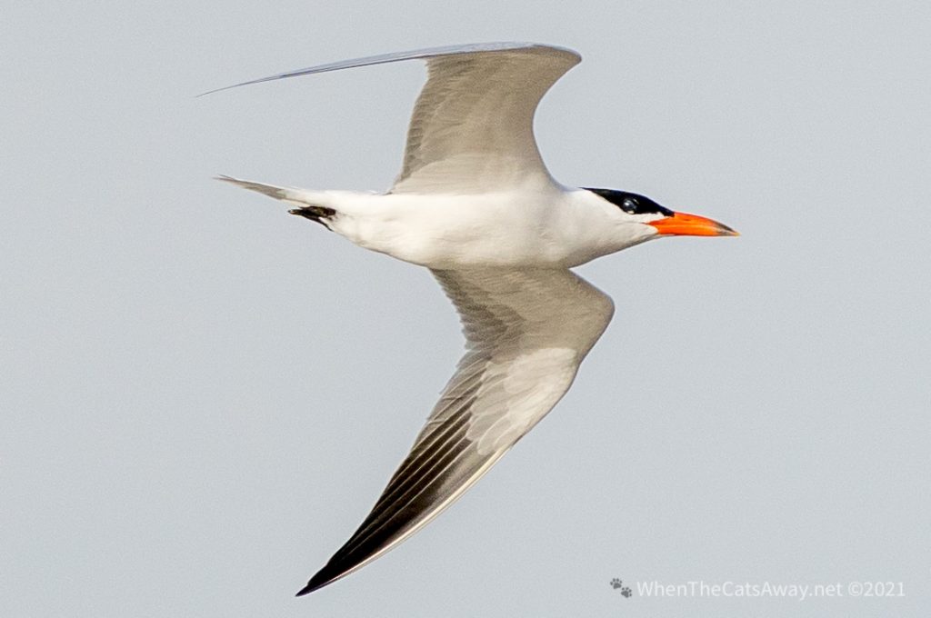 Caspian Terns on the beach – they are the largest of the Tern family and usually solitaryCaspian Tern – so streamlined in flight – they turn into narrow darts when they drop from the sky to catch fish. Their latin name translates as ‘Water Swallow’ – you can see that here