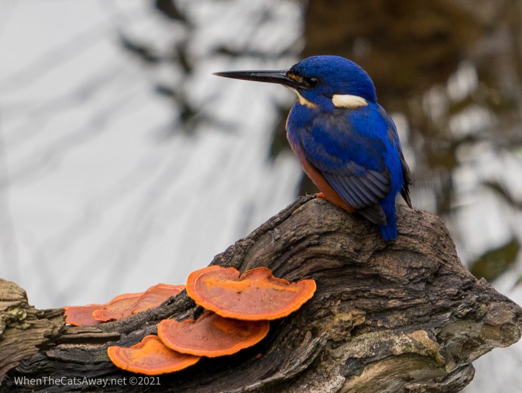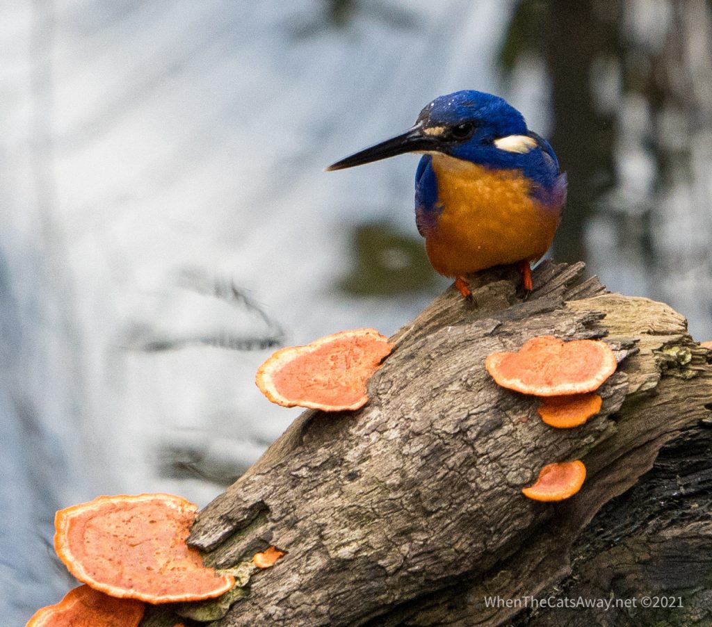 Spectacular colours of the Azure KingfisherThe Kingfisher kindly lands on a partially submerged branch covered in orange fungi, to bring out the beautiful orange colour of its chest