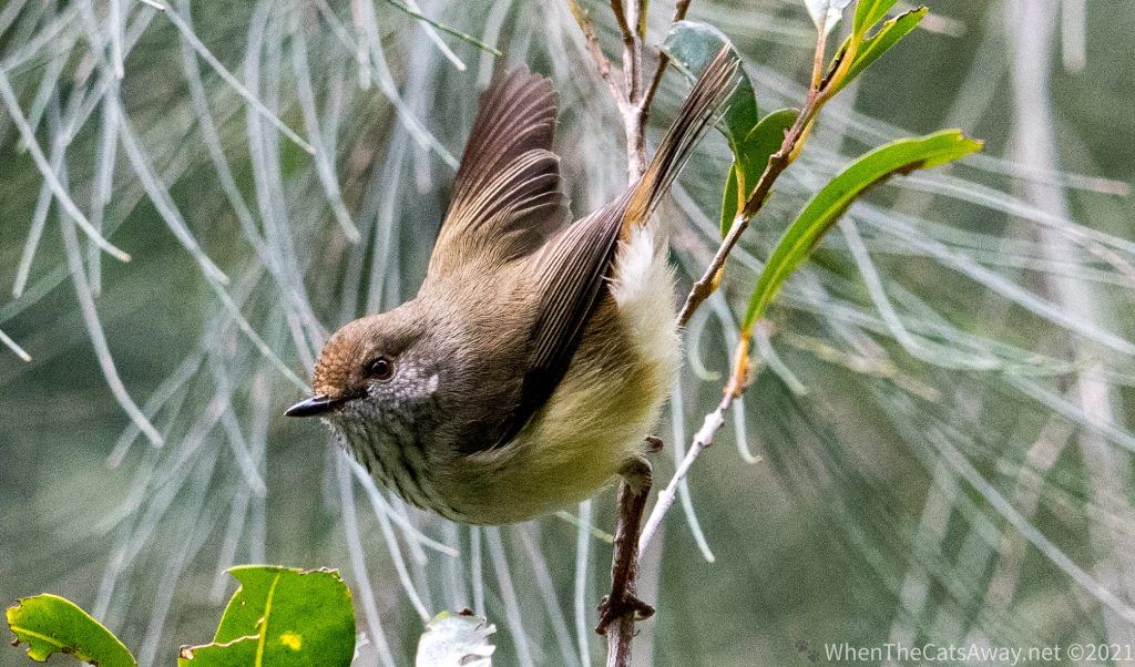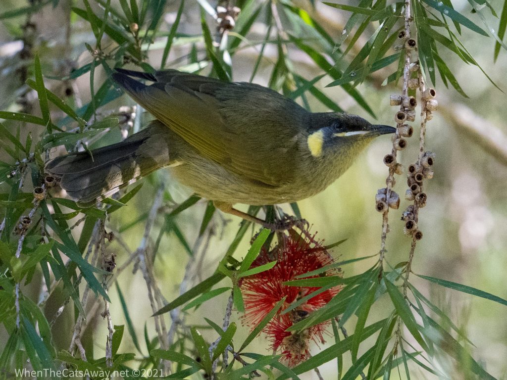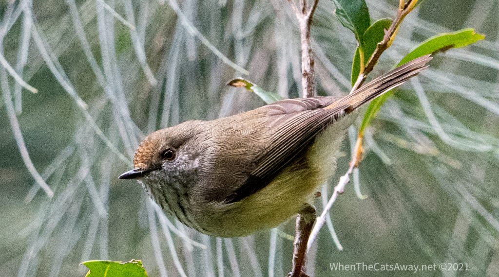 An unimaginatively named Brown Thornbill entertains us in the riverside undergrowthAnd our Brown Thornbill gets ready to take off again – they only stop still for a second or twoGolden Whistler – pretty shy but with an incredible voiceA Yellow-spotted Honeyeater drinks nectar from the bottlebrush flowers