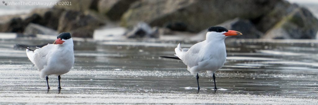 At the water’s edge sat a pair of Caspian Terns, taking off and gliding effortlessly over the waves. These are quite robust birds, but they still remained pointed into the wind so their feathers wouldn’t get messed up!