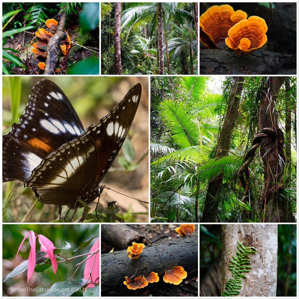 Setting off on the walk – what a contrast to our time in outback QueenslandThe diversity of plants and trees never fails to entrance usA feast for the senses – a Varied Eggfly Butterfly amongst lovely leaves and fungi in the forest