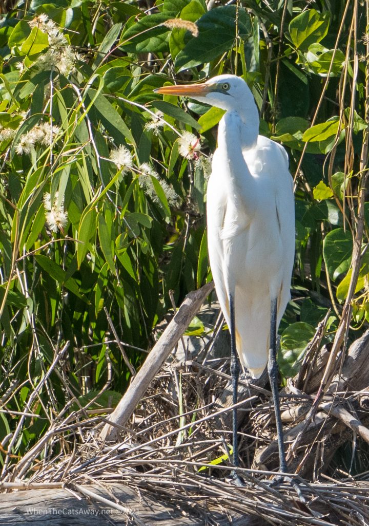 A calm morning on the riverA Little Kingfisher – the second smallest kingfisher in the world (the African Dwarf Kingfisher is slightly smaller)A majestic Brahminy Kite watches from the top of a tree alongside the river. These are sometimes known as Red-backed Sea-eagles, as they are generally found on coastal wetlands.A pair of Radjah Shelducks bravely at the water’s edge. All birds will make a nice snack for one of the local Saltwater CrocodilesThree of the eight Green Pygmy-Geese we saw swimming up and down the river. They have wonderfully patterned feathers and are only found in tropical freshwater wetlands in Northern Australia. A male (centre) and two females.A Striated Heron flies across the still watersA Little Black Cormorant – these have green eyes. While those feet look awkward on the branch, they can really propel them when catching fish under water.This tiny bird is a Large-billed Gerygone and this is its nest. It constructs its nest on a flimsy vine to discourage unwanted visitors (like snakes) and disguised to resemble flood debris.We never tire of seeing the stunning Australasian Darters – these are the spear fishers of the bird world – piercing fish underwater with their beaks.After a good session spear-fishing it is important to dry the wingsA Little Egret with a feathery beak problemOne of many Rainbow Bee-eaters along the river catching insectsA pair of Papuan Frogmouths roosting in a tree along the river. The male is the darker grey colours on the right, while the female is browner.A male Shining Flycatcher – a deep metallic blue colourNot the best photo, but you can see the inside of the male Shining Flycatcher’s mouth is bright orangeThis is the female Shining Flycatcher – she has a copper back and tail, white chest and metallic blue head.A Pacific Baza – before here we’d only seen these in pictures. It is a hawk with a great hairstyle that mostly consumes insects.As their name suggests, Cattle Egrets spend their days with cows, enjoying a symbiotic relationship consuming insects attracted to their bovine mates. At sunset they all congregate in trees along the riverbank to roost. About six cows per year are eaten by crocodiles.A Night Heron emerges after sunset to take on the evening fishing shift