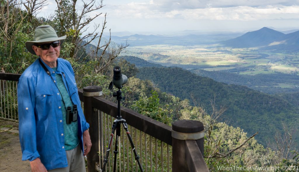 Looking down from Eungella into the valleyMr A finds another use for his spotting scope to look down the valleyOn a clear day you can apparently see all the way to Mackay and the coast from here, just over 90km away