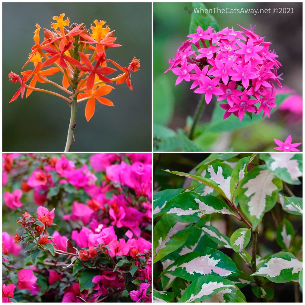 Metallic Starling munching on palm tree fruitA tiny female Sunbird drinking nectar from a passionfruit flower – you can see how little it is in relation to the passionfruitCommon Putat/Powder Puff flowers – they flower at night and are pollinated by bats and insects, before dropping off in the daylightBottlebrush Orchid growing on a tree. There is barely a branch without another plant growing on itMore orchids growing in the trees. All realestate is considered fair game in the rainforest!