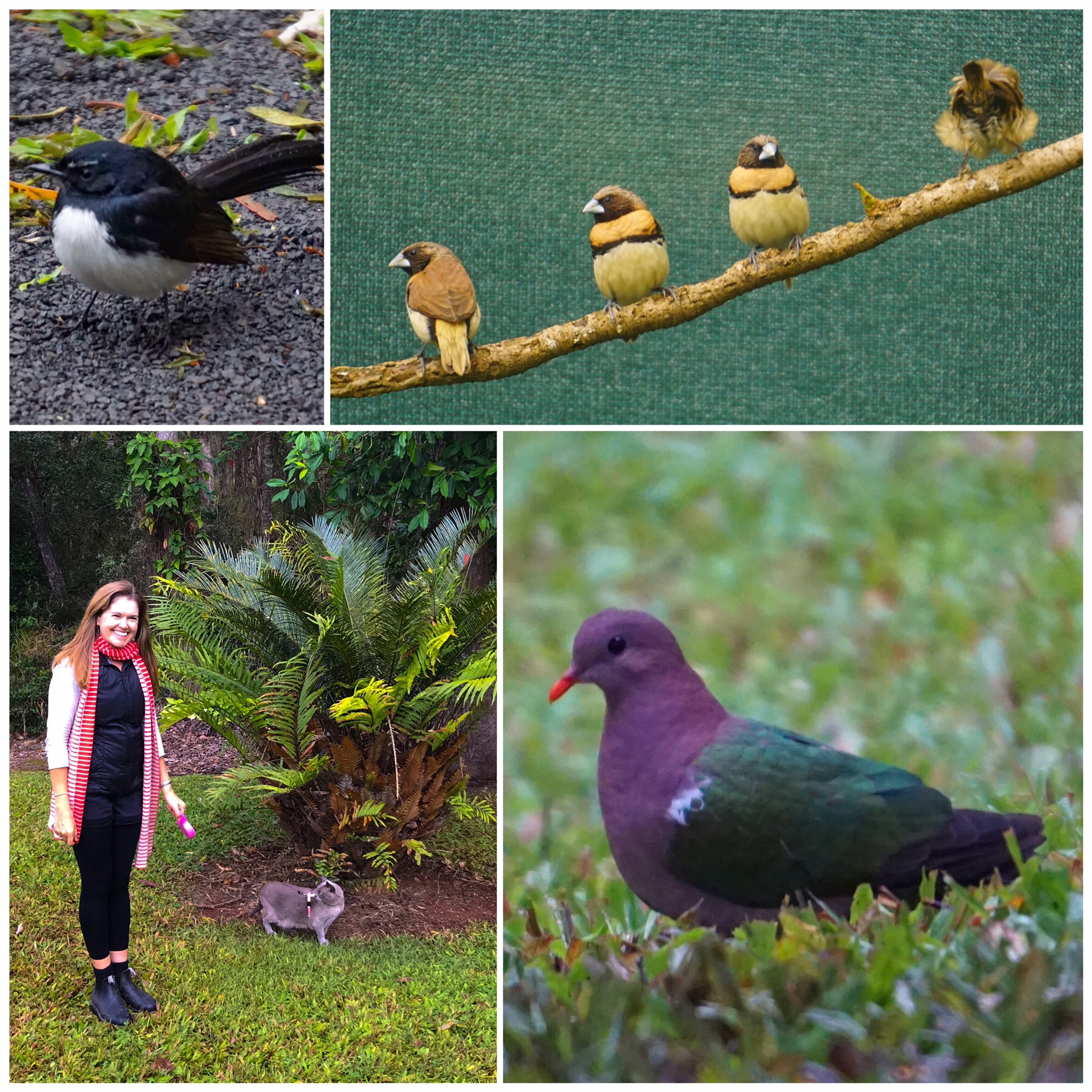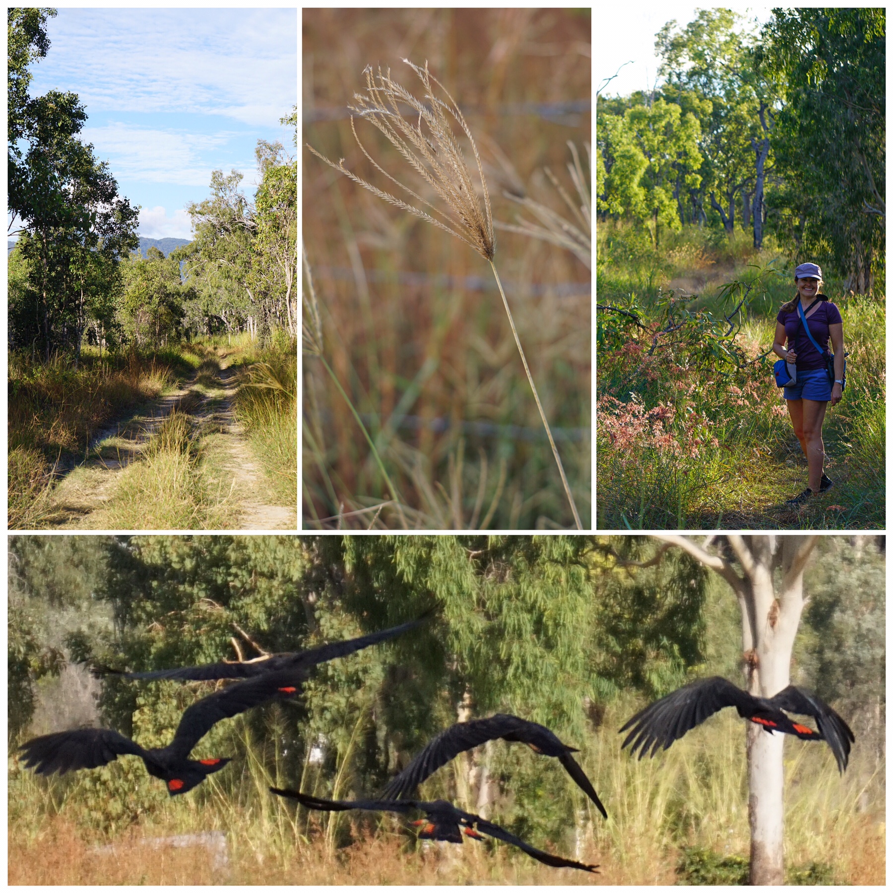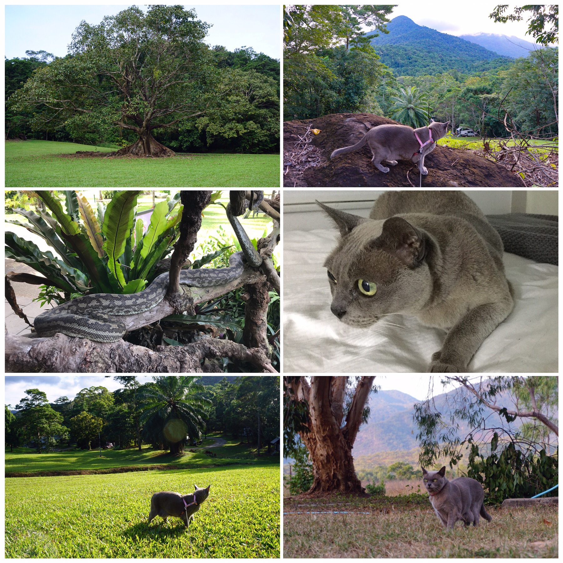 There are plenty of birds here. We have spotted pale yellow robins, firetails, finches galore, and lovely purple and green fruit doves feeding on the mandarins on and below the tree beside where we are camped. The little black and white Willy Wagtail is the feisty one, always flying at Tassie and frightening her back indoors. I guess he’s met some hungrier cats in his lifetime.