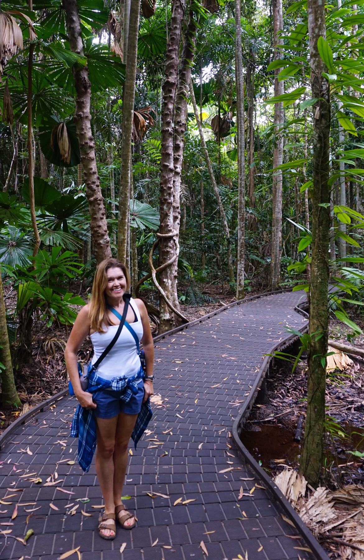 We could have stayed longer – much longer – but we decided to head off for a walk, hoping really for a cassowary sighting. Alas, it was not to be. However, we did get to experience again the majesty of being immersed in this unique ecosystem. Some of the trees we spotted were huge, especially next to the lovely little package of Mrs A. Some of these are over 500 years old apparently. Brightly coloured cassowary plums littered the floor, and crystal clear streams regularly meandered across our path.