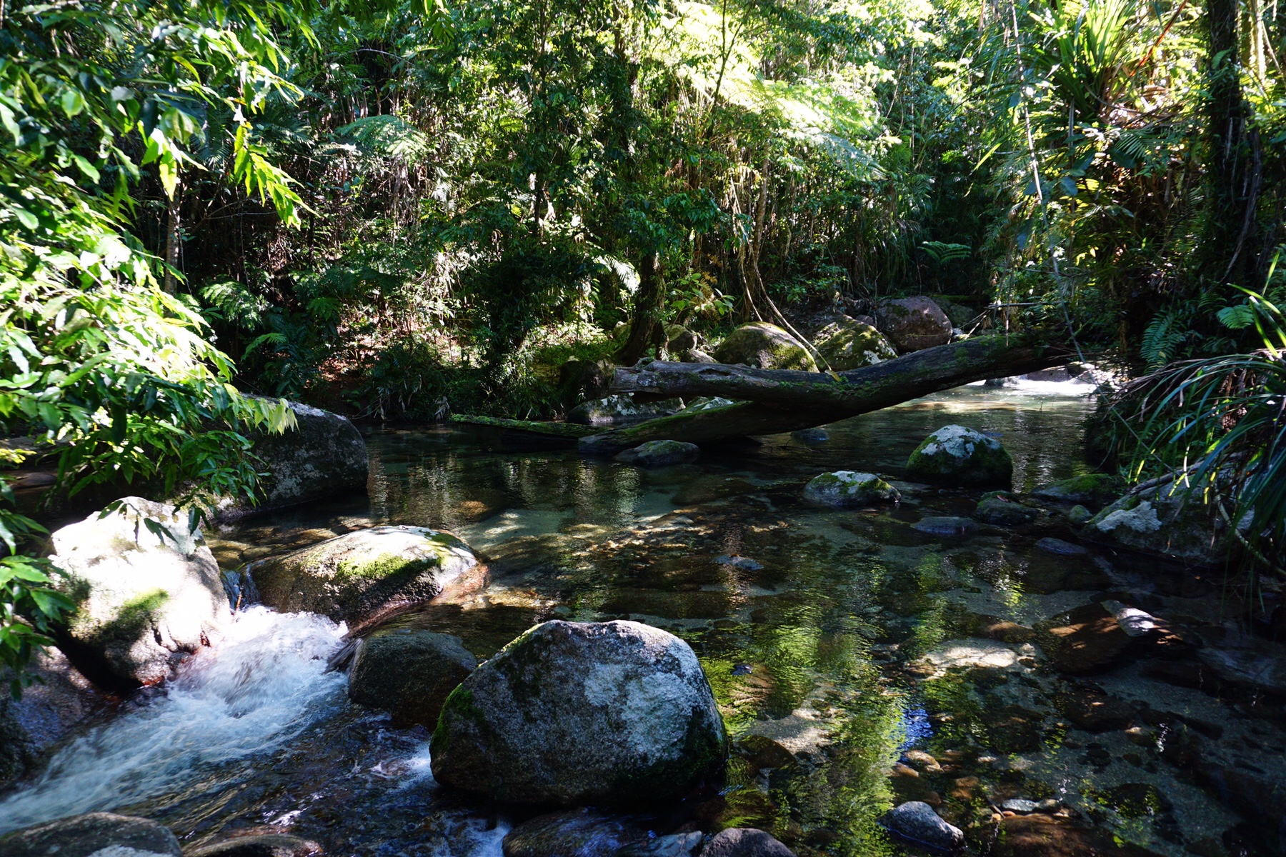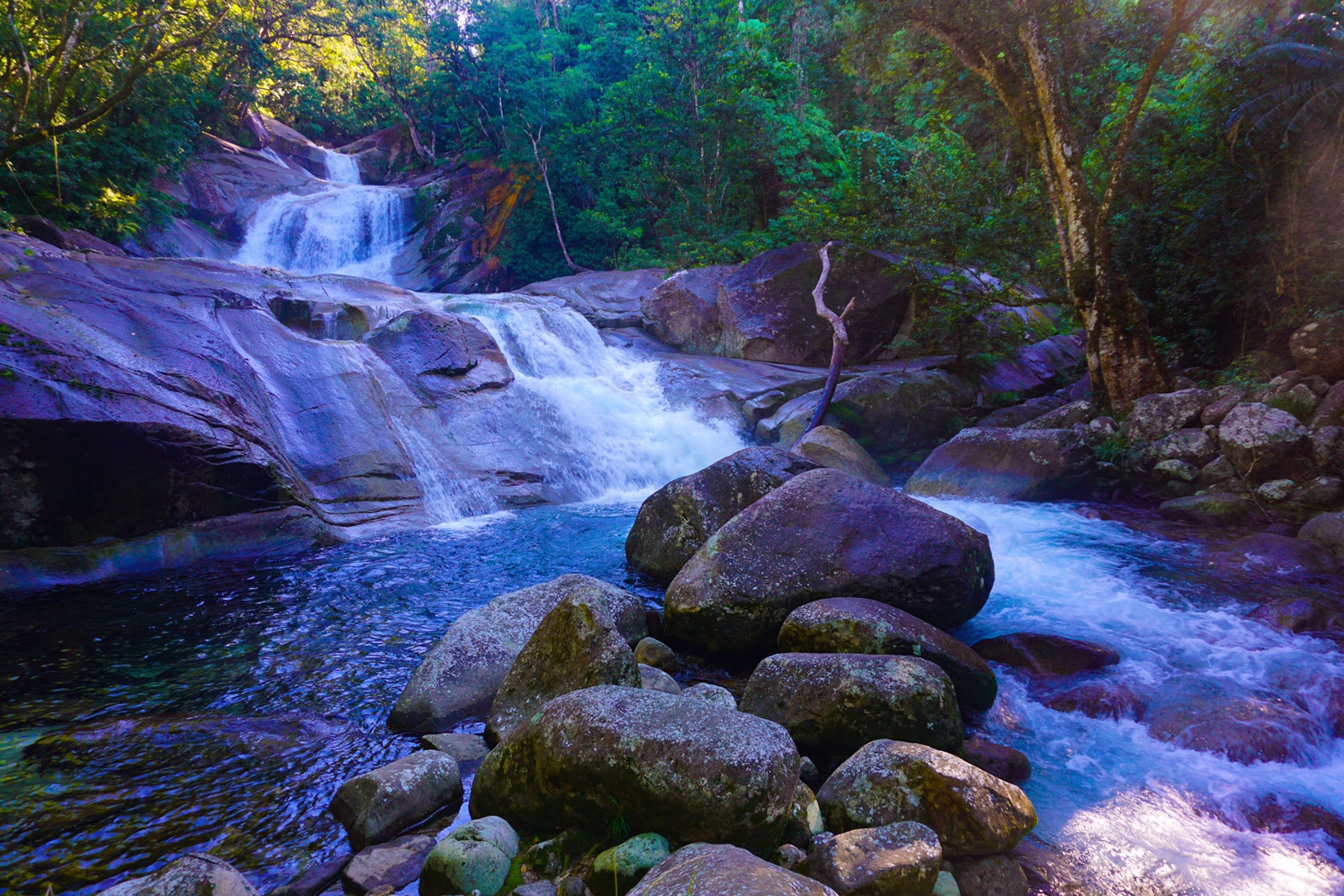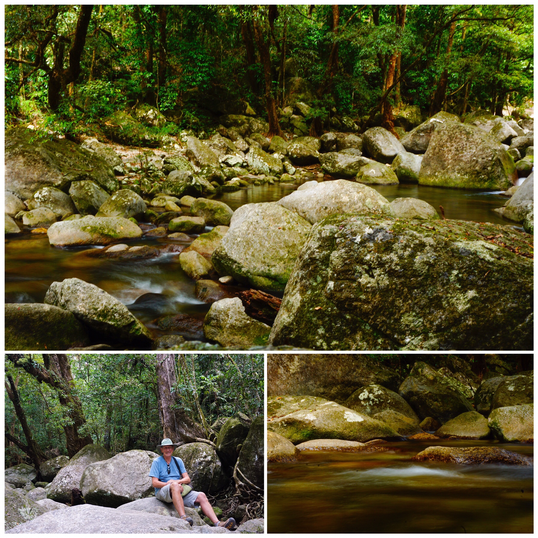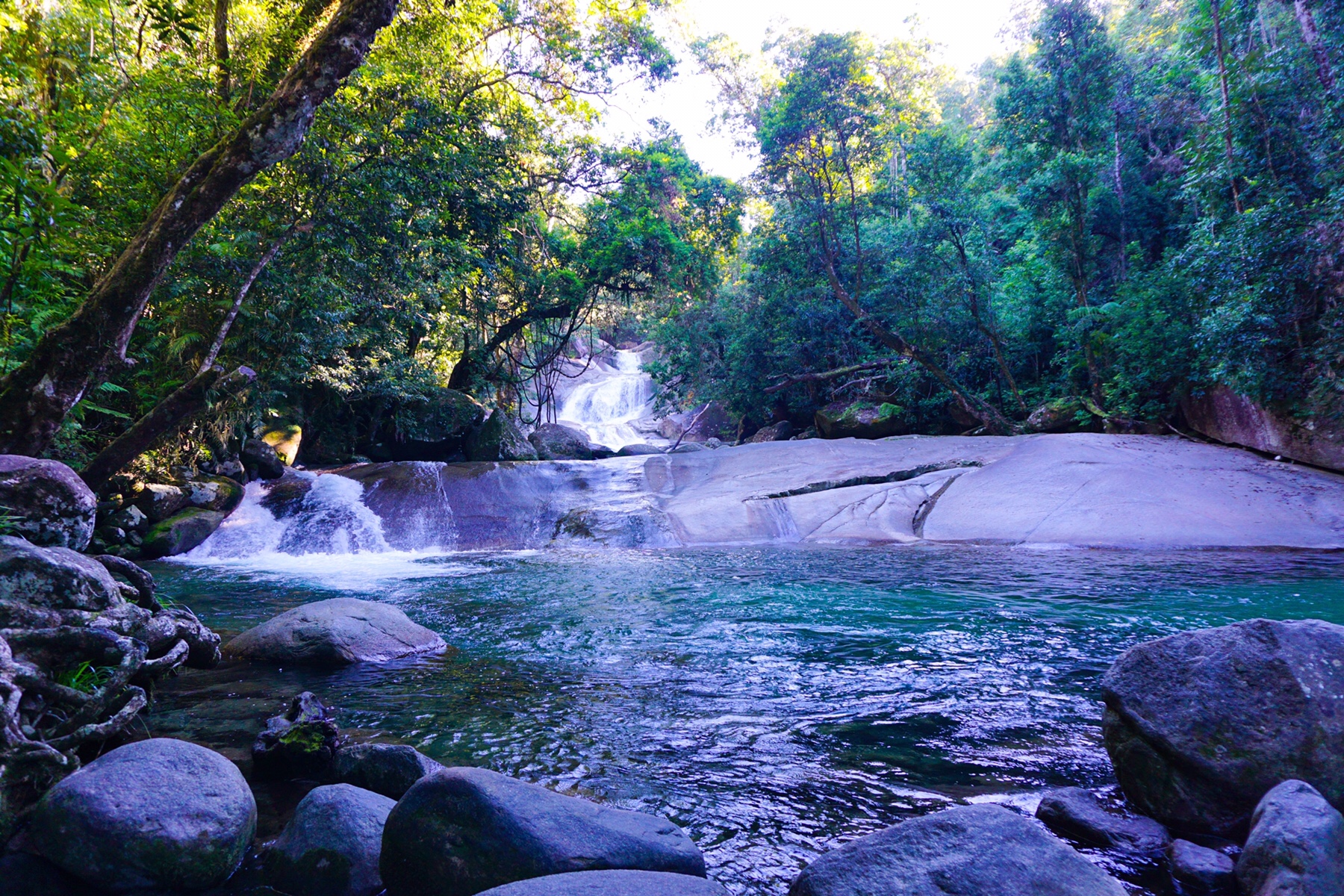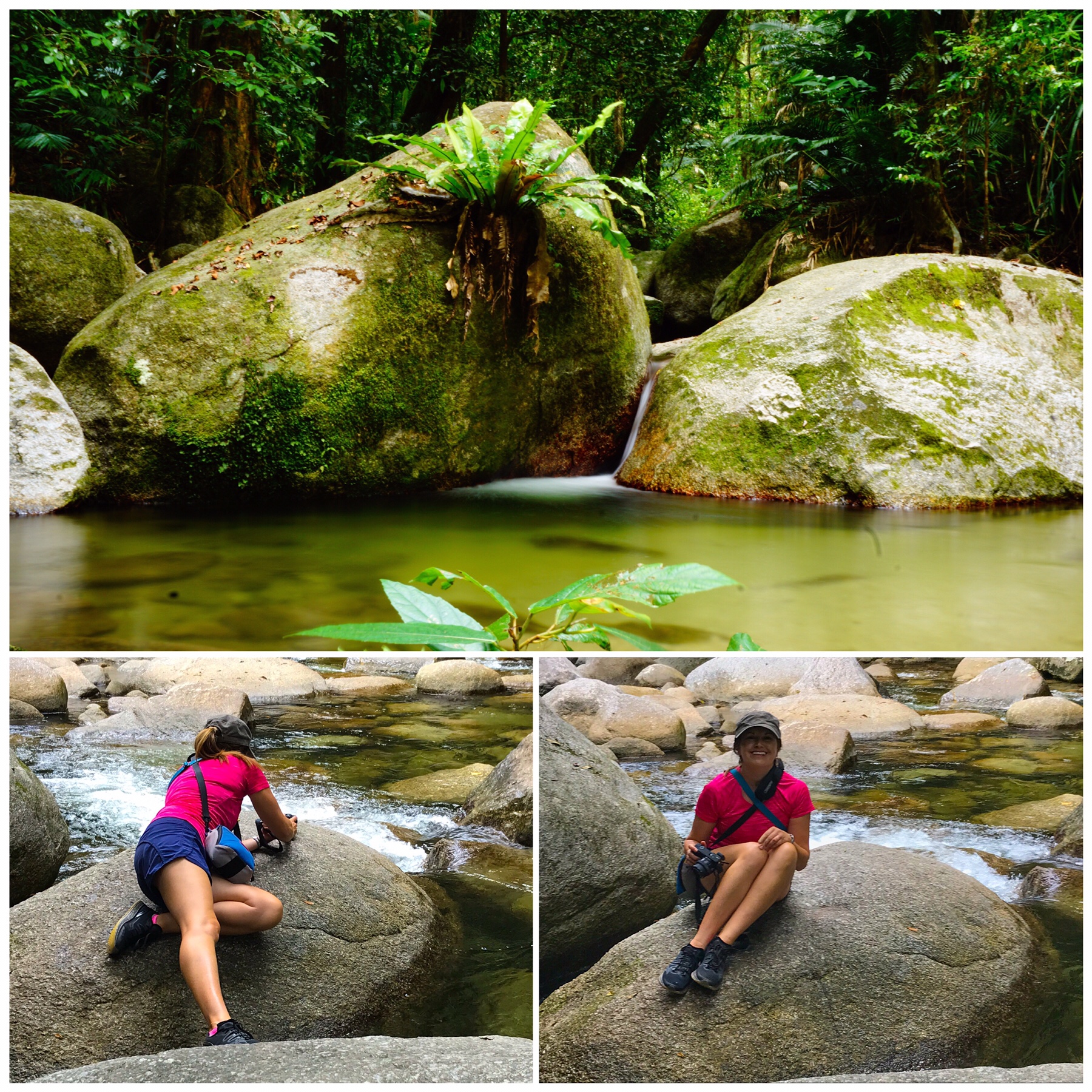 Once away from the swimming areas it is relatively peaceful, moss covered rocks with a crystal clear creek tumbling down all around, surrounded by old growth rainforest of the Daintree National park.