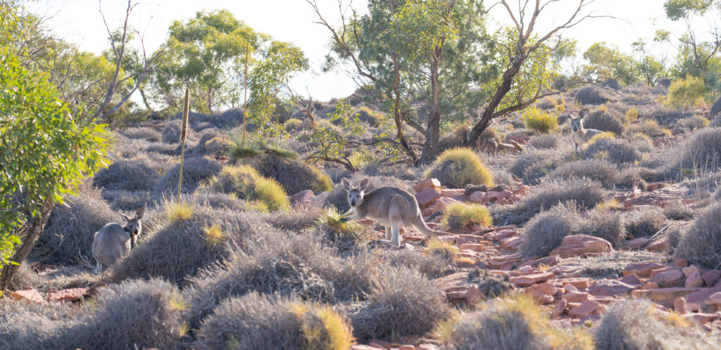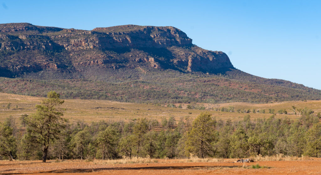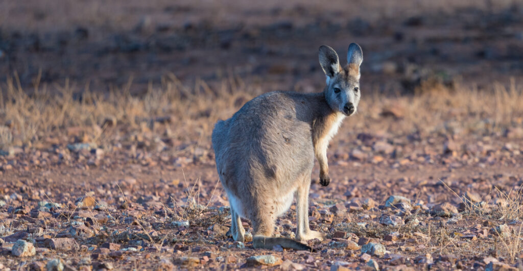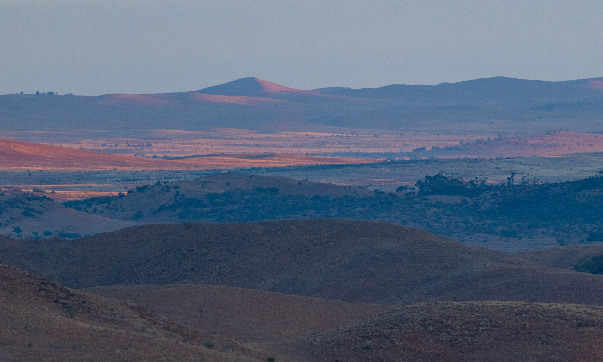 Travelling through country like this we felt exposed without our home being towed behind us. We had nowhere to stop and shelter should we break down. The surface deteriorated, as we had been told it would, and we had to slow right down. The surface here is made up of what is called gibber rocks; what is left after the sheets of sandstone have been broken down over the millennia by erosion, and the sand and dust has blown away. Careful driving is required. But we had to press on as night fell. It really isn’t a smart idea to drive in the bush at night, especially on these unfenced roads, where wandering stock can suddenly appear.