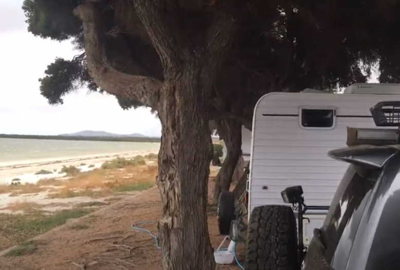 I thought the Thursday before the Easter Holidays we might be ushered away, but no, they were immediately under the van testing a few things. Great service, and once again demonstrating that South Australia wasn’t as busy as we anticipated. Sadly the upshot was a new set of steps. So we booked in for the following week hoping the parts would arrive on time. Looks like Port Lincoln was going to be our home for a little longer than planned. Well that wasn’t going to be too arduous to bear when we saw the site we had been allocated! No, that’s not a painting of an idyllic bay dotted with islands above Tassie’s head, that is our view!