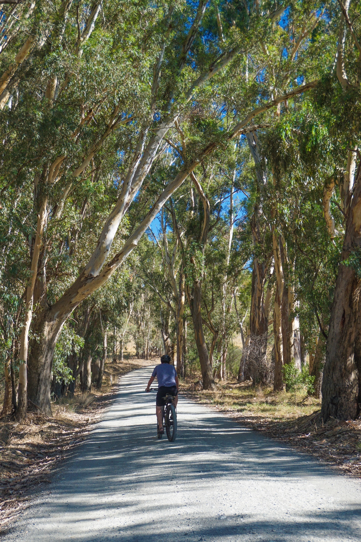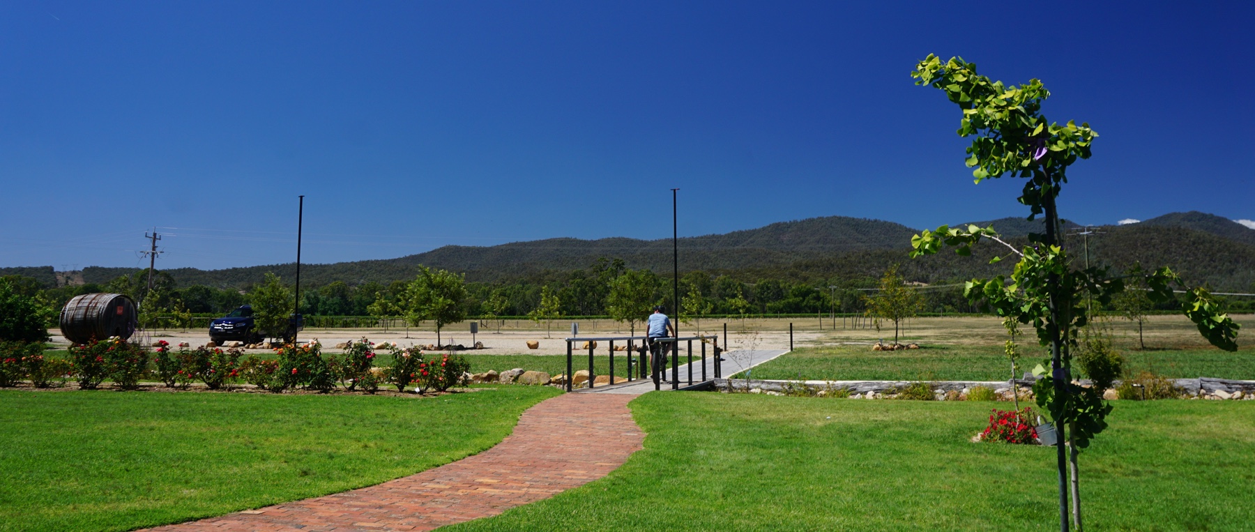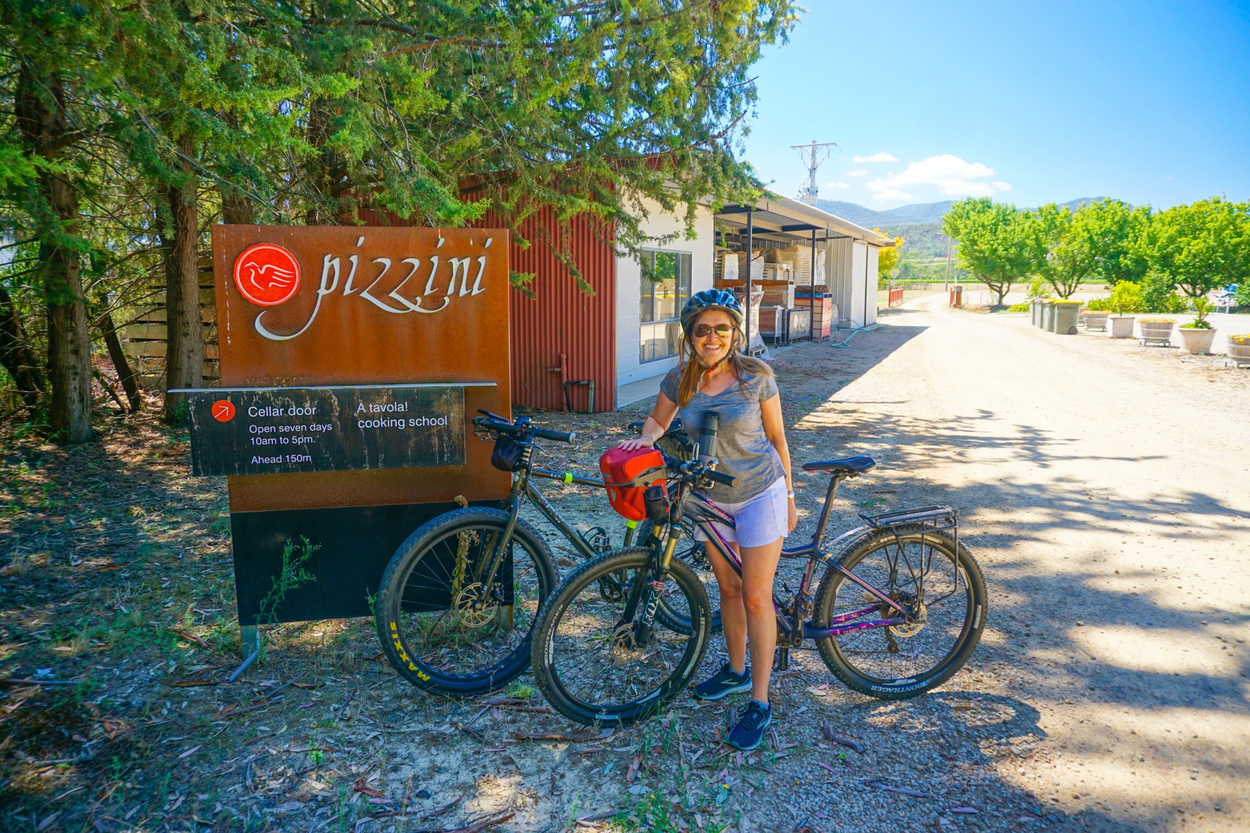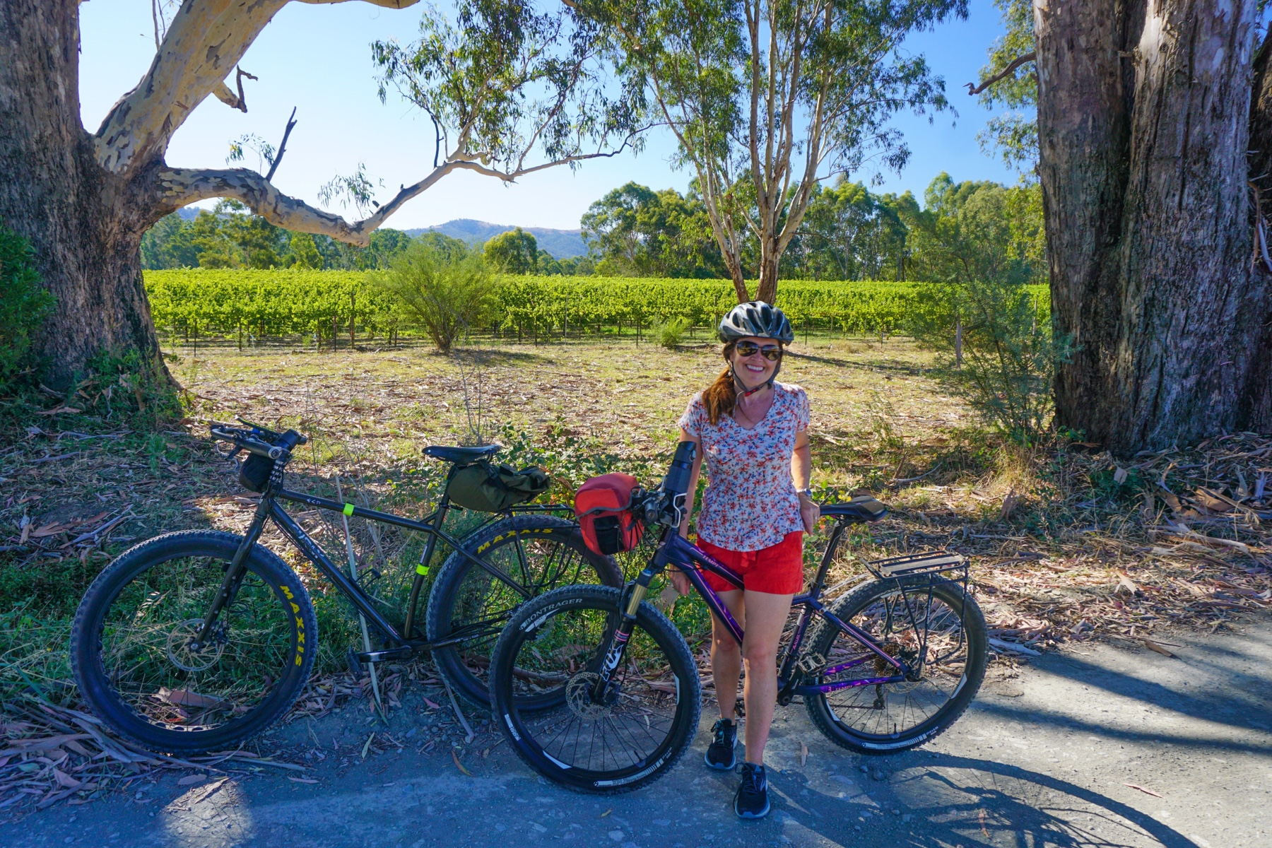 We rode a short way along the trail, stopping when a steep downhill faced us. Already having a narrow airway and now blocked nose and swollen sore throat, I wasn’t up to cycling uphill again without a motor! Pennyweight Winery located beside the path saved the day and we called in for a tasting.