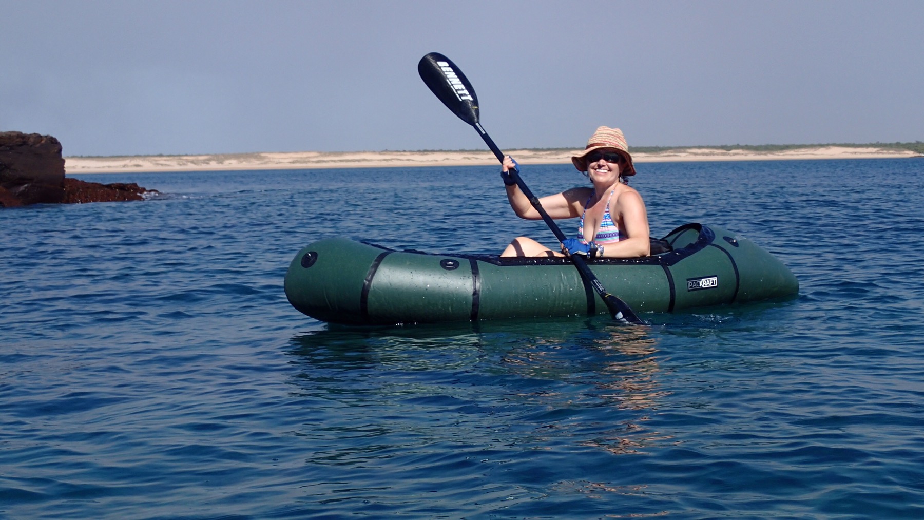 In a jiffy the packrafts are inflated and ready to go. We did get a few curious looks as we minced down the beach with our odd looking little boats under our arms. Heads held high, off we went into the wide blue yonder. It was fabulous. We headed up the coast for a mosey around, then back down the other way to land on this pristine beach, not a footprint in sight. Well until Mrs A decided to run round in circles to make some – so great to see her back to her old self after the crap breathing she has been experiencing  almost since the start of the trip.