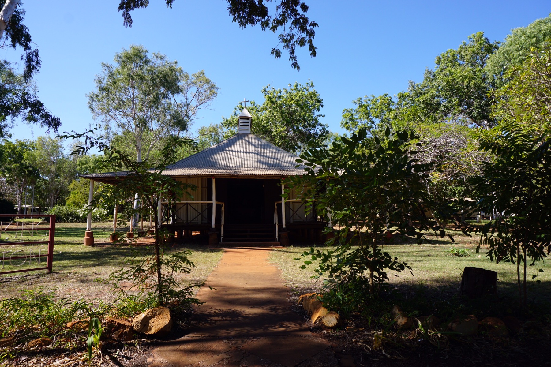 We set off after breakfast, pausing to change a fuse which had blown our car fridge (putting our cold beers in jeopardy – but thankfully easily fixed) and then continuing on. We headed north up the Dampier Pennisular, aiming for the Aboriginal community of Lombardina. This quiet community is extremely neat and tidy, famous for its 1930s church and the incredible beach. We paid our $10 visiting fee (basically pays to use their air compressor and brings in some much needed cash to the community) and set off to explore. The church is quite interesting in its architecture, built from mangroves, tin and local trees – and much of the 1930s furniture still in use: