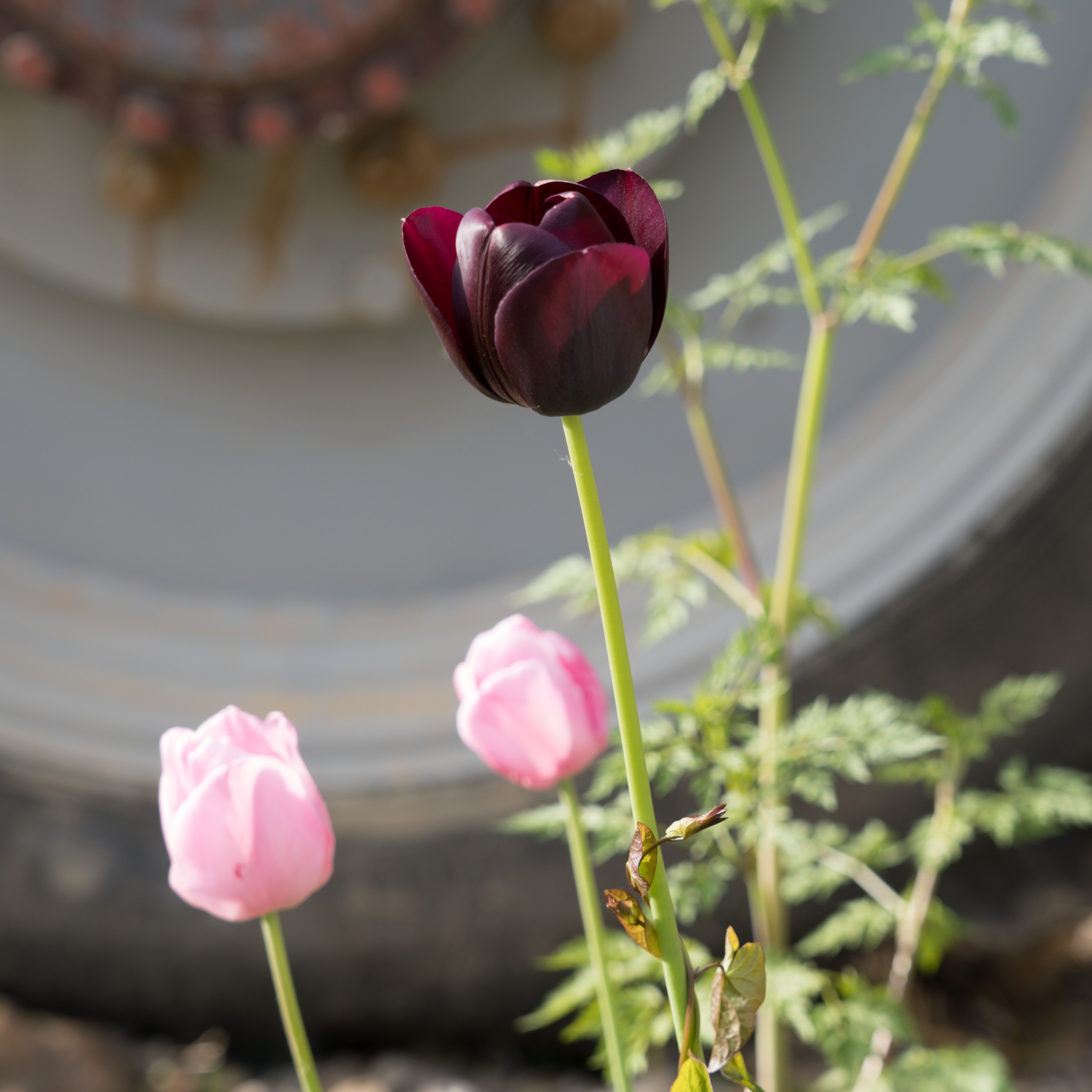 Loving the tulipsA beautiful array of tulips on the entrance to a mechanic’s workshopMonsieur A very proud of his ‘Je voudrais du pain s’il vous plaît’