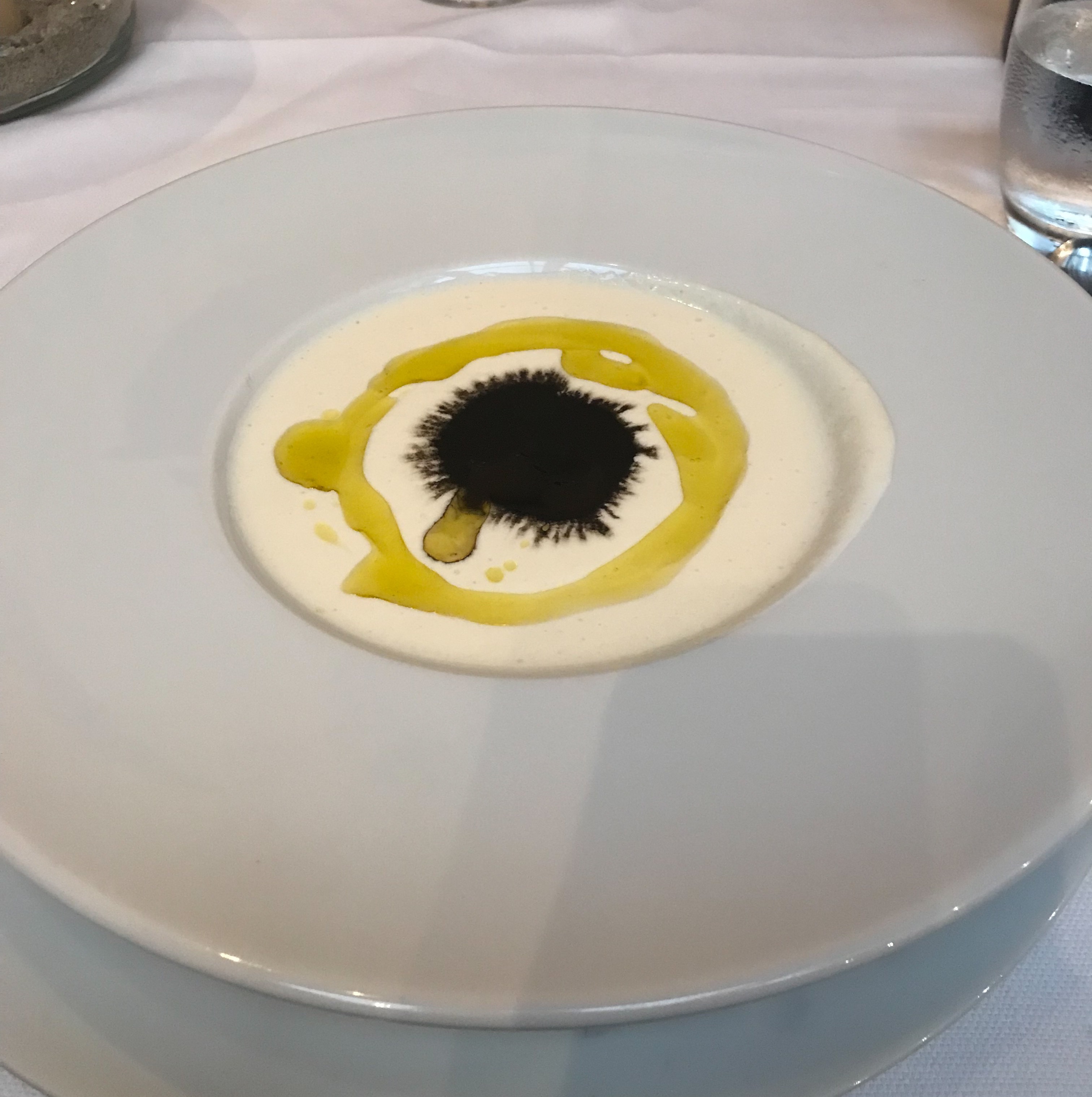Mark’s appetiser of pecorino and potato compote with black squid ink and olive oil…