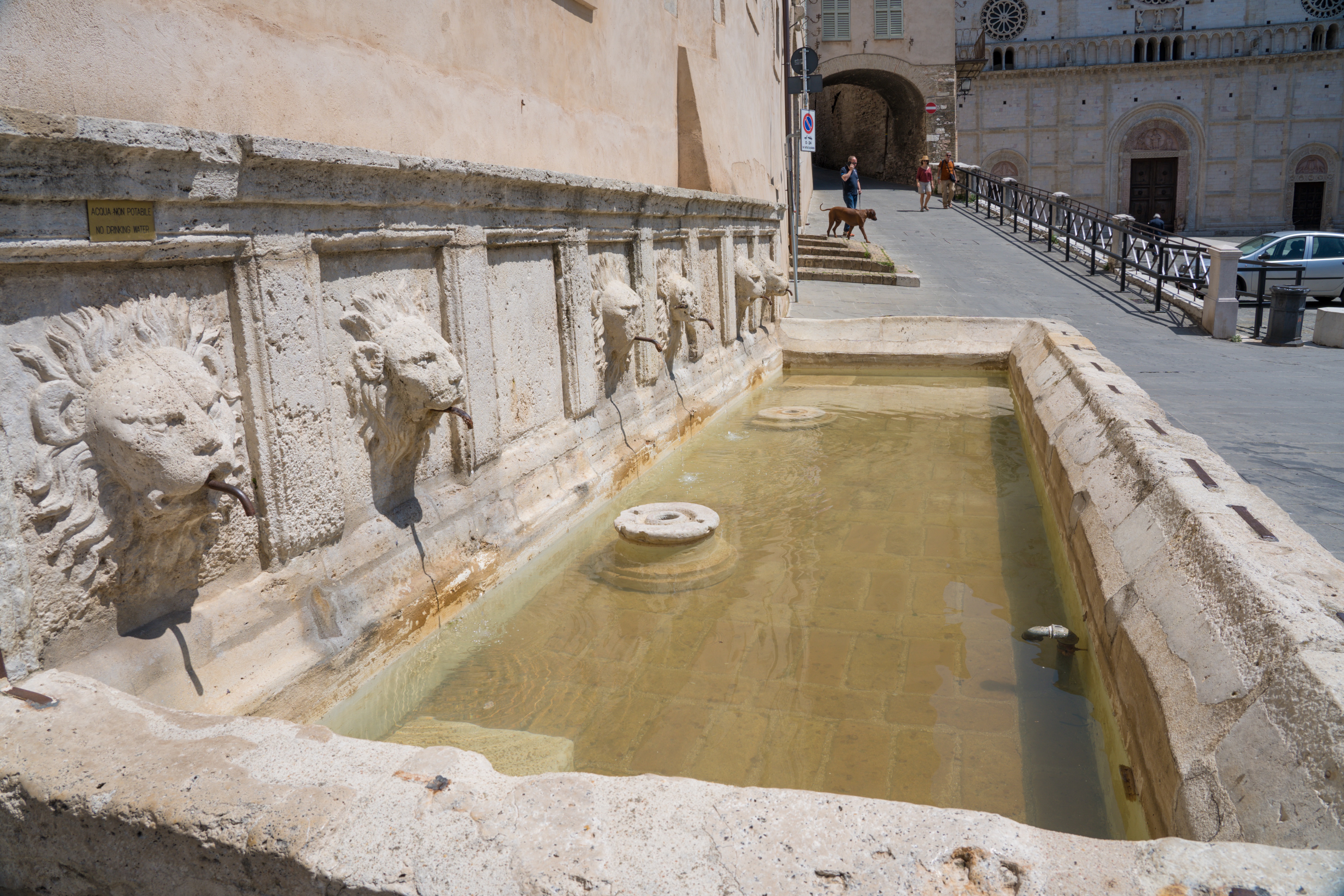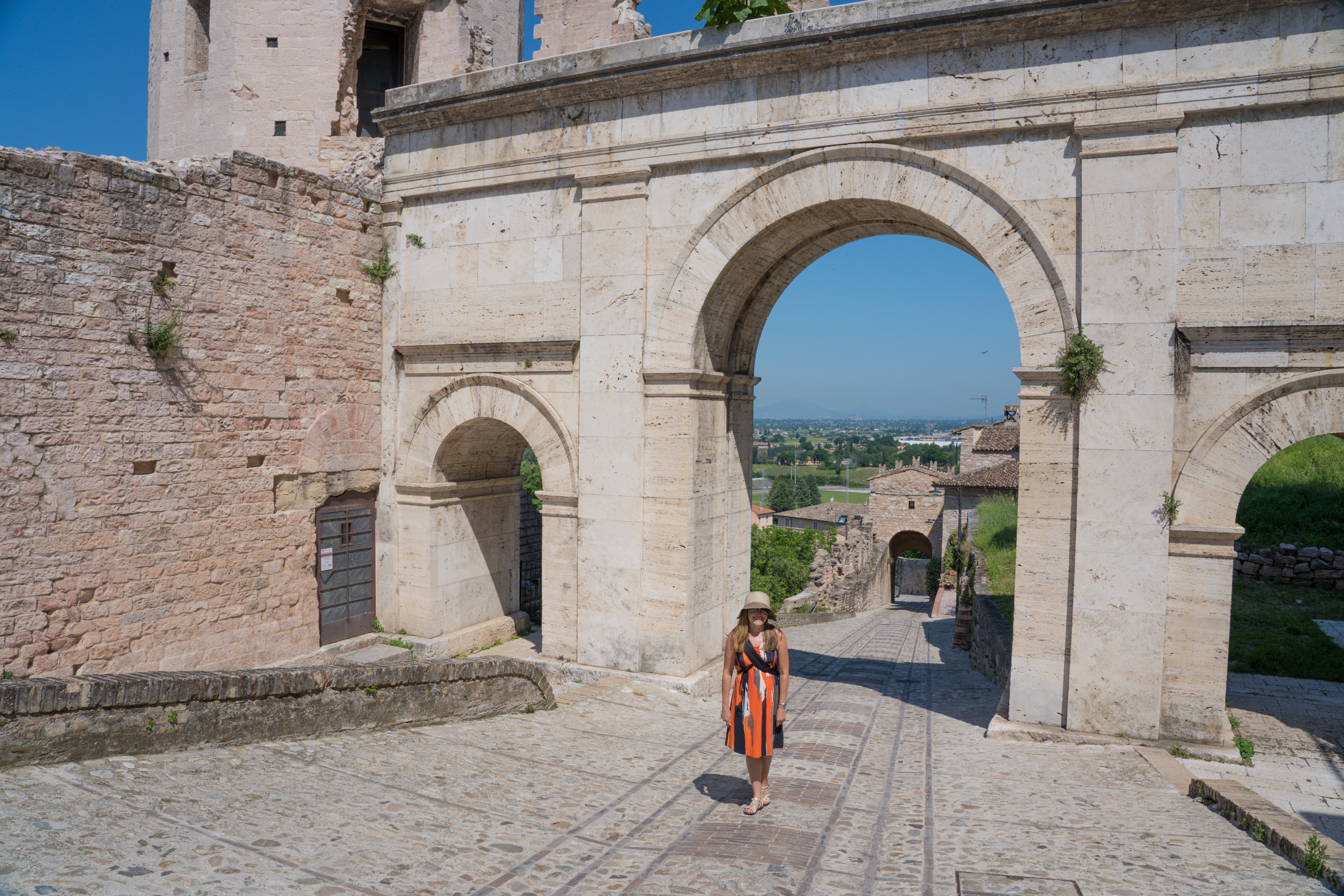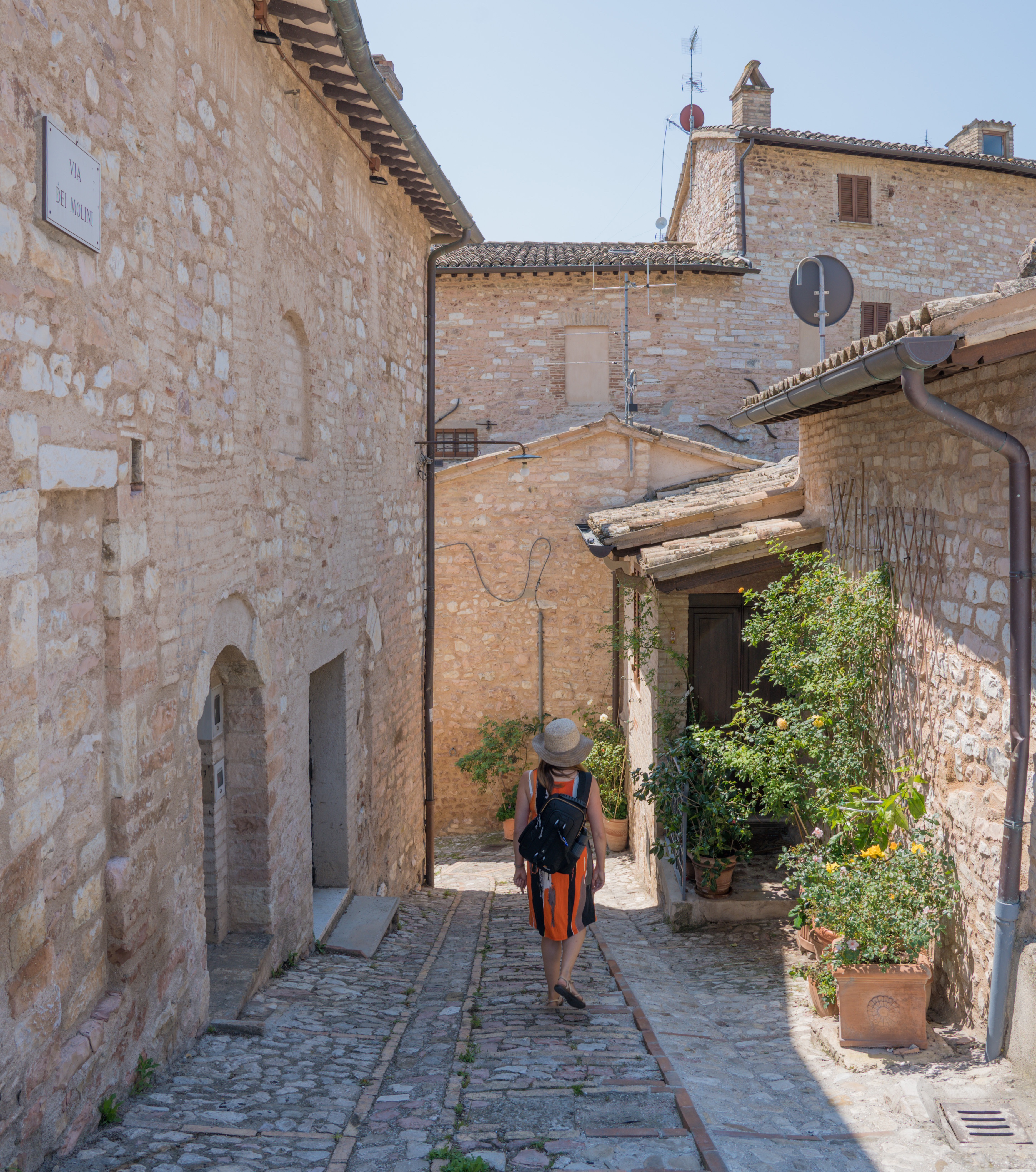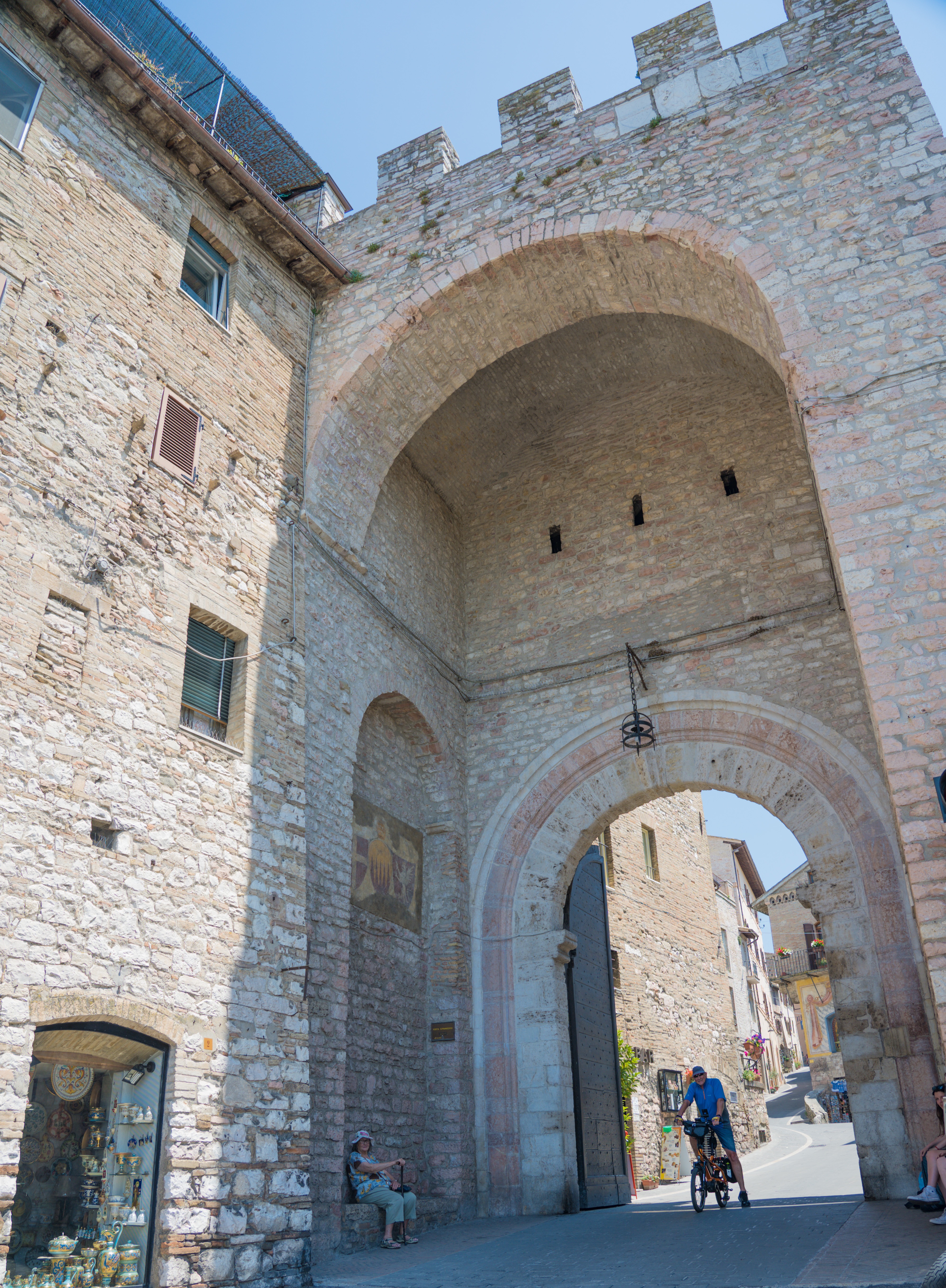 We entered through a grand gateway flanked by towers, amazed that there was not a soul around. In fact that is one of the main appeals of this town – it is so close to Assisi but there are so few tourists here. The streets and buildings are quiet, taking on a pink hue from the Mount Subasio limestone used in their construction. The constant call of swallows can be heard as they swoop catching flies around the rooftops, and the hum of insects on the ever present flowers.