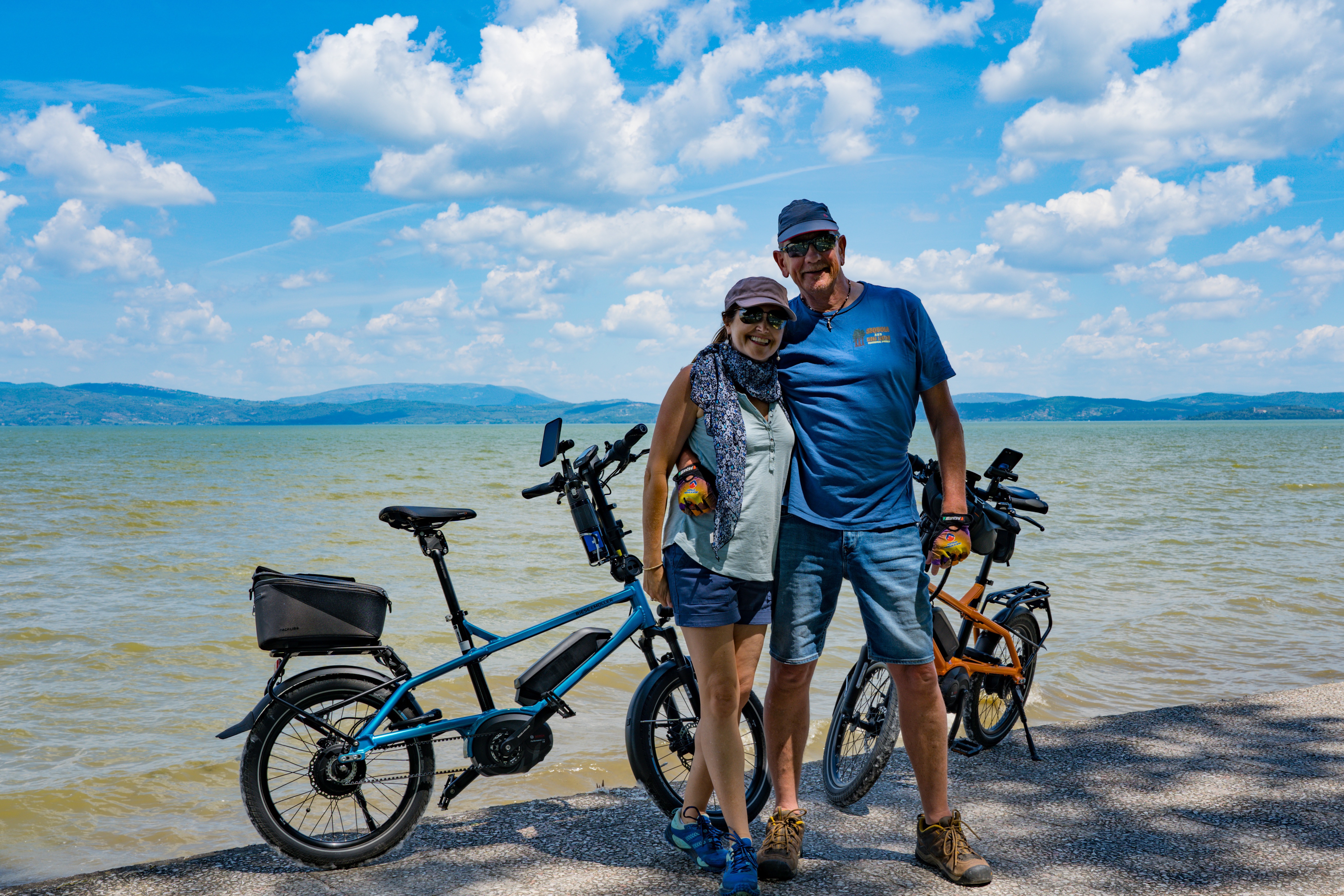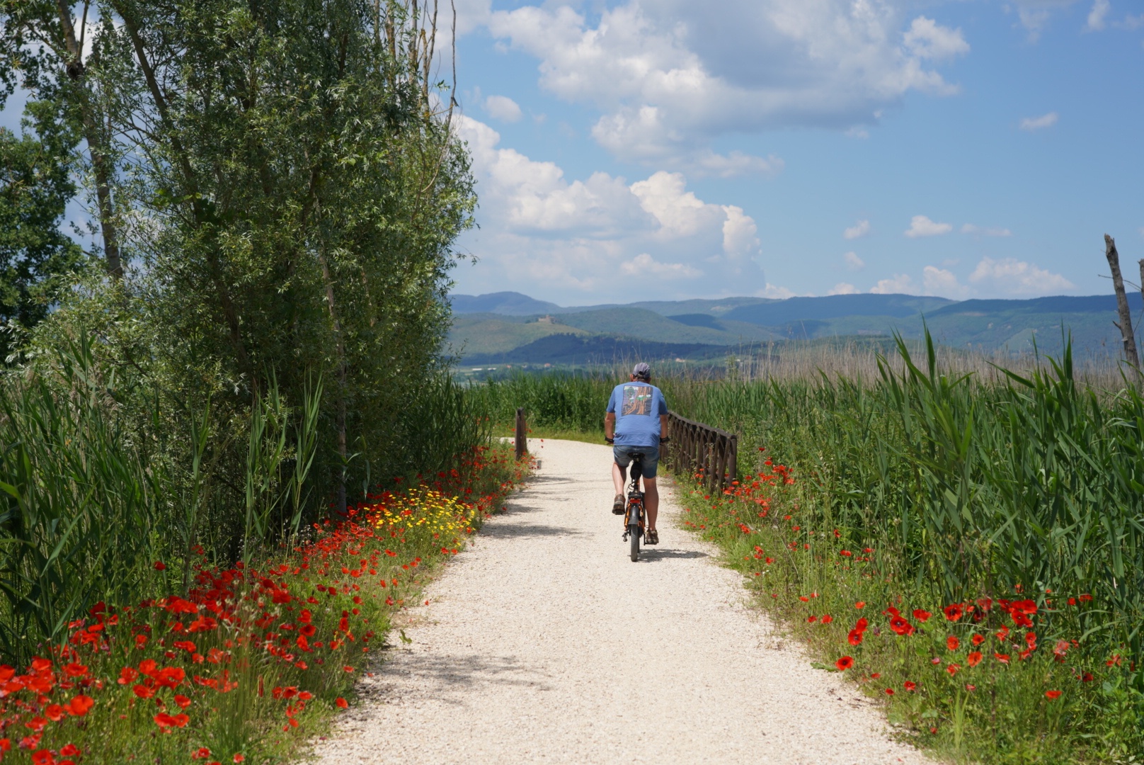 After a relaxing lunch, we jumped on the bikes for a ride. There is a route which goes right around the lake – just over 70kms, but apparently the heavy rains during the winter have raised the lake’s levels and some of the pathways are covered with water. We decided to do a 45km return ride, heading towards the north of the lake from our sosta. It was a perfect day for ride – the weather warm but not too hot, birds singing, cuckoos calling from the woodland, butterflies fluttering by, everyone in a great mood…