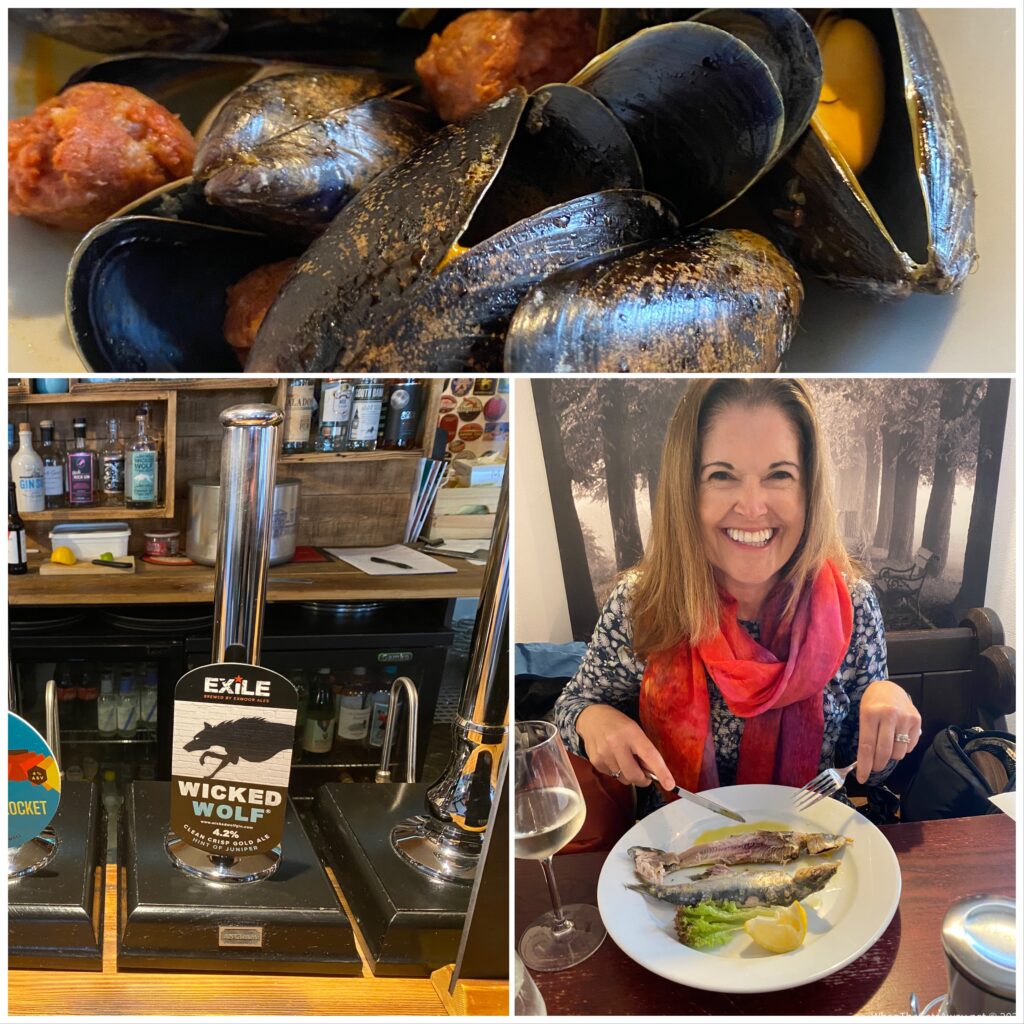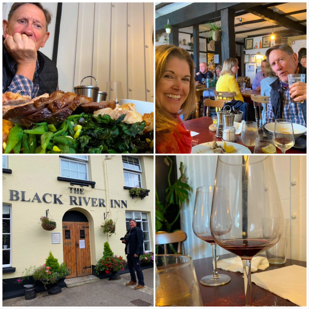 So that was that. We were back on our own. The wind subsided to a fresh breeze, and it stopped raining briefly, so we jumped on our bikes and rode into the local town of Holsworthy for a pub lunch. It was the last day of the “Eat Out to Help Out” scheme the UK government has been running to help the pub and restaurant industry by providing £10 a head subsidy at participating restaurants a few days each week in August. We’ve not managed to use it before, so was nice to get a cheap feed.