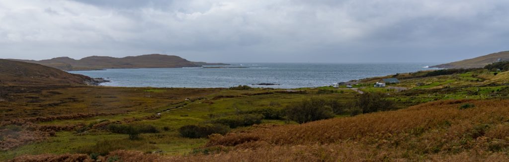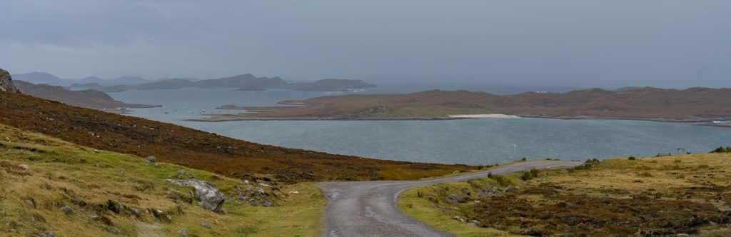 Down at the most southerly point of Harris – we wondered what life is like for the residents of this little house with a fine viewPeat bogs are plentiful and there is much evidence of it being dug for fuel…here on an estuary it looks like little islandsAs the rain and wind sets in for the afternoon and we head north, the scenery changesMore atmospheric scenery as we head in to Lewis