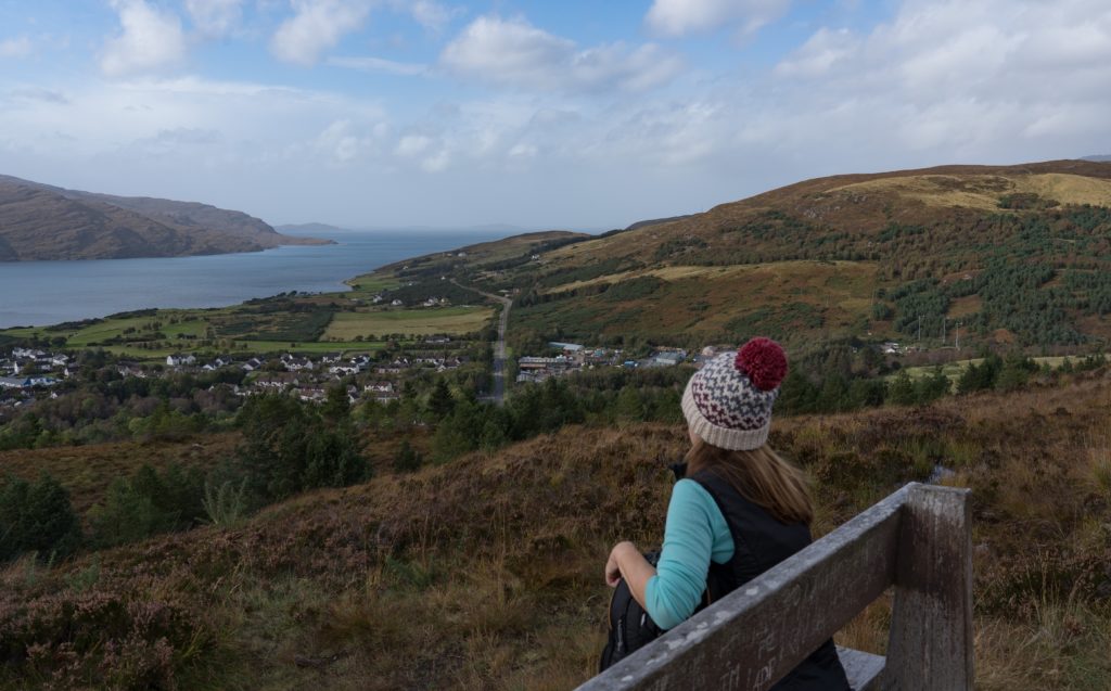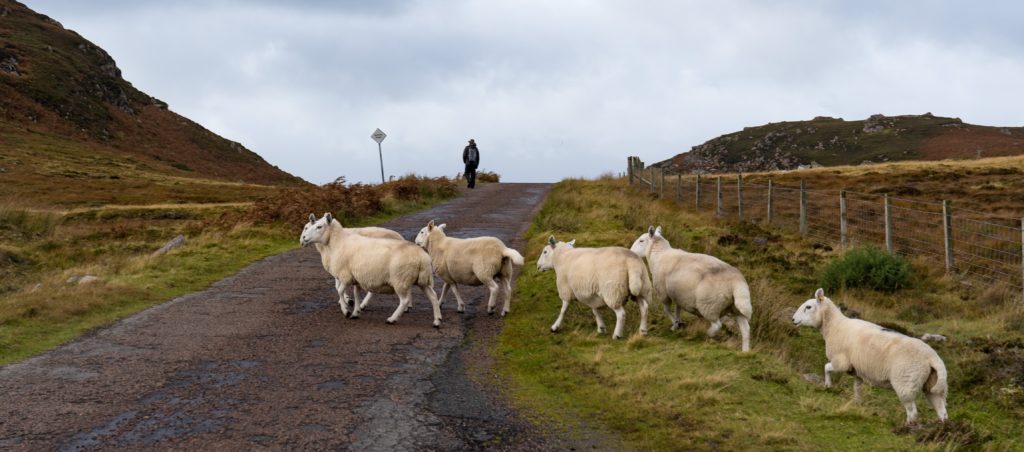The blue skies belying the freshness of the morningThe Church of Christ (Cille Chriosd) – built in the early 1500s – it was superseded in 1840 and has since fallen to ruinThe single track road with a passing point aheadThe sheep are grateful for their wooly coats, at 10 degrees, it’s quite a brisk autumn day A lovely spot for a tea breakThe wind whistled across the water as we stood and admired the Cuillin HillsLooking out to Cuillin Sound as we drive down the hill towards GlasnakilleA lovely Robin followed us on our walk through the tiny villageThe little white building on the right is the tiny little school – we saw around 6 students chasing around the playgroundMrs A loving the scenery from behind glass!The sun peeps out from behind a cloud, highlighting the hills for mere seconds before moving on to another locationThere’s a bit of slow moving traffic on the road, you cannot be in a rush here