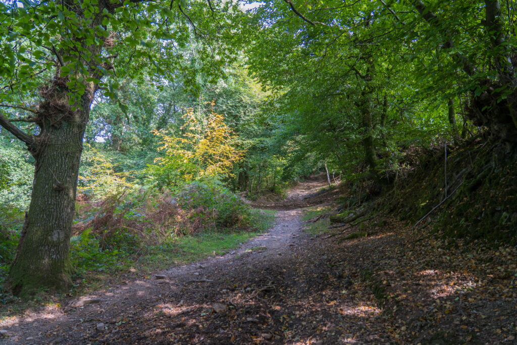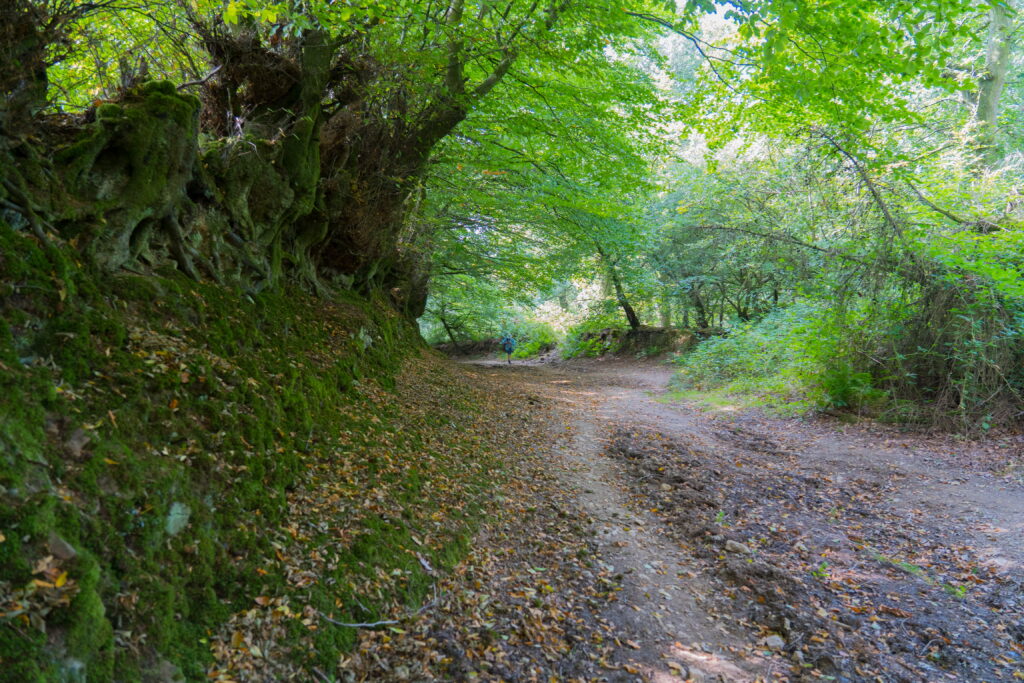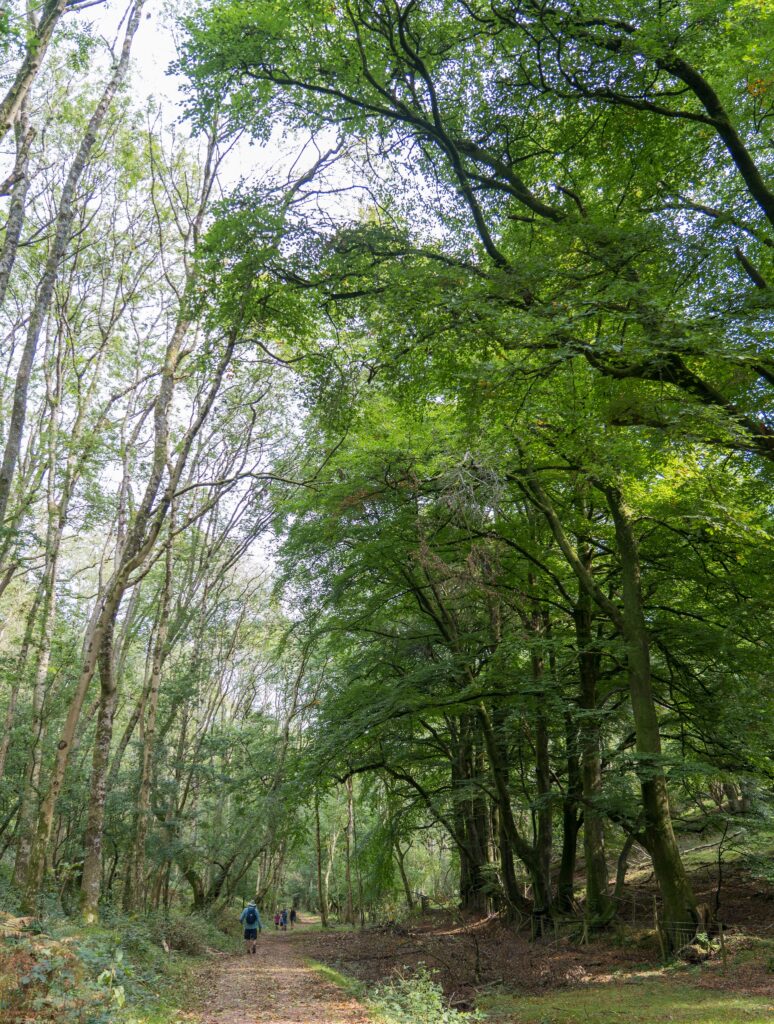 Stout Lane – we have seen this change from bare branches, to buds, to full leaf, and now beginning to look autumnal A scattering of beech leaves on the groundAfter 25 minutes climbing straight up, it is straight down again on the other side of the hillsAnd down…last time we came here it was full of sheep with their lambs…now cows and calves enjoy this valleyThe towering woodlands as we walk towards the village of Aisholt
