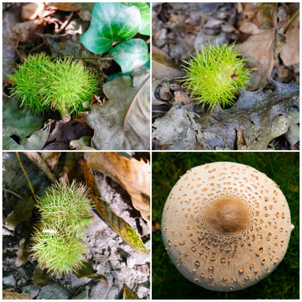 Looking like delicate lace, the last of the flowers blooming in the woodlandA magnificent thatched cottage, the Old School House in Aisholt. Apparently it was the holiday home for Sir Henry Newbolt (a poet in the 1800s) and the house that Coleridge thought of renting – but his wife said no!It was so warm we retreated to the shade on the hike back up hillA perfect toadstoolLooking north across the hillsThe hikersA hill pony. They have recently been part of a roundup and all the foals have been taken away to be sold.Early fallen sweet chestnuts and another perfect toadstool