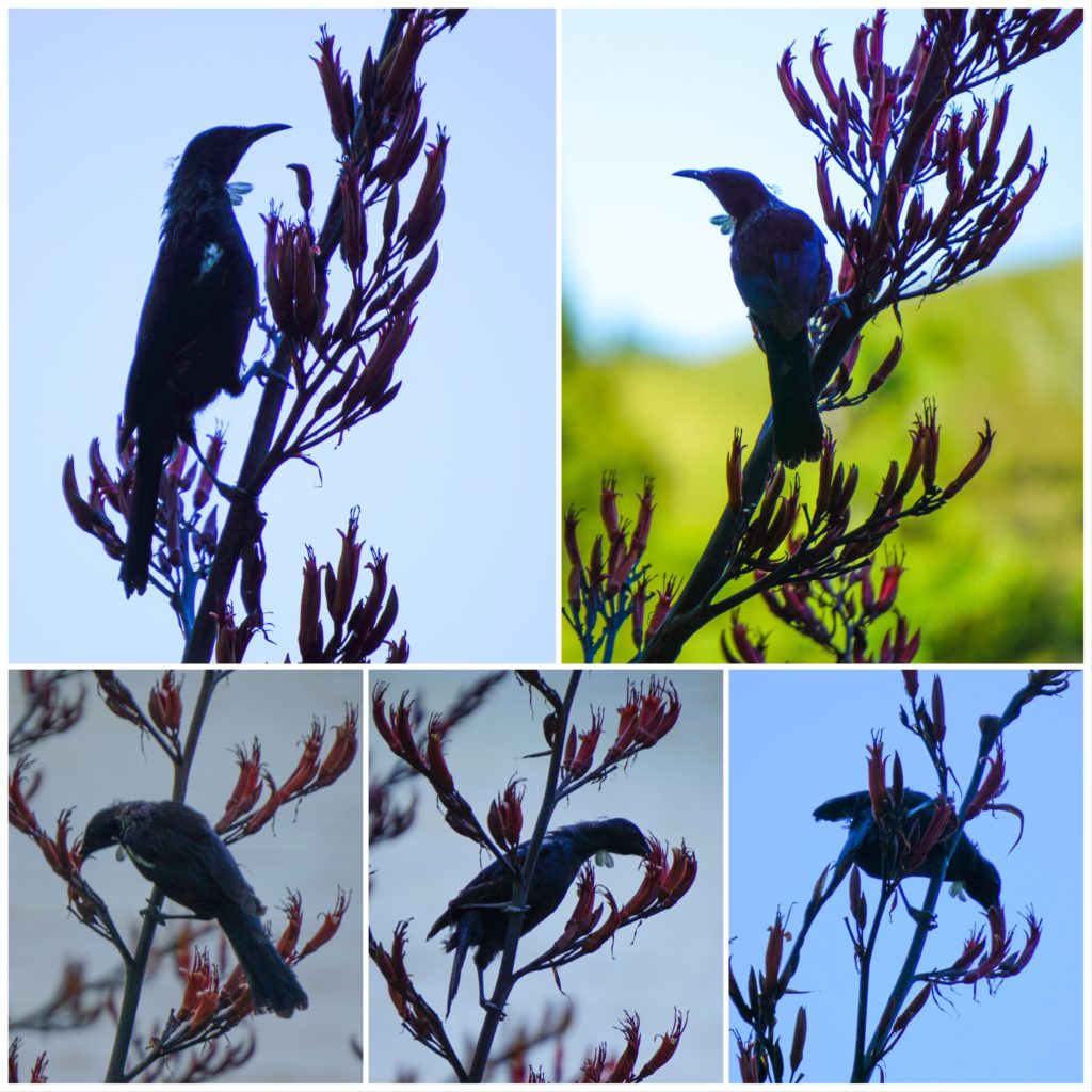 This is such a picturesque time of year to visit New Zealand. The Pohutukawa trees (known as the native Christmas tree) are all in bloom, filled with nectar loving birds such as the native Tui and the introduced rosellas. Ever swooping in front of us were a pair of sacred kingfishers, entertaining us with their antics as they caught little fish in the shallows. Apparently kingfish and snapper are common around here.
