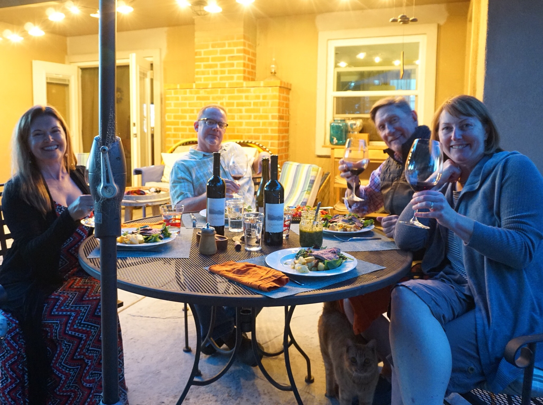 Dinner was a California speciality, a tri-tipped steak, seared in a pan then baked in the oven. It was spectacular, served with potatoes, fresh salad and tomatoes and basil from their garden. The cheeky neighbourhood cat, Diego, joined in hoping to steal some snacks.