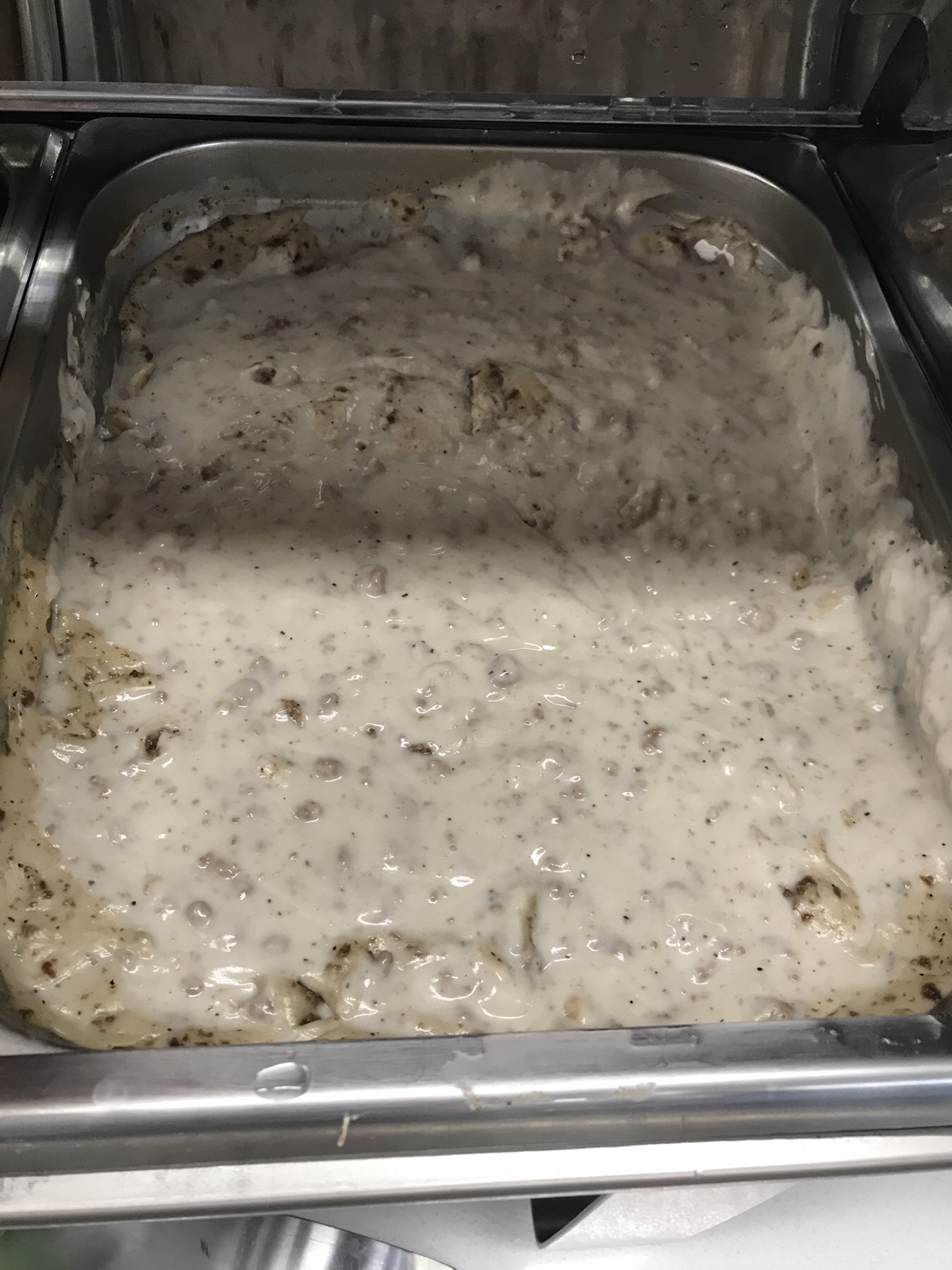 Now, apparently the grey porridge looking substance in the photo is….biscuits in gravy. Not something I’m going to add to my roast beef anytime soon!