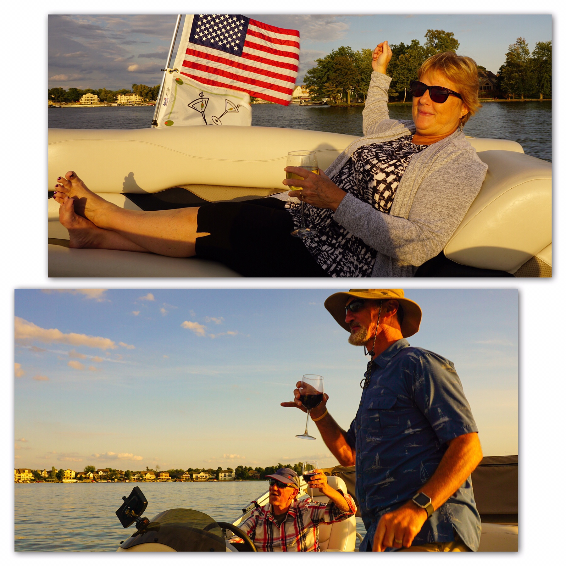 To end this fine day, our last with these guys for a while, we headed off on their boat to potter around the lake and watch the sunset, clutching Manhattan cocktails Carol had prepared for us “to go”.