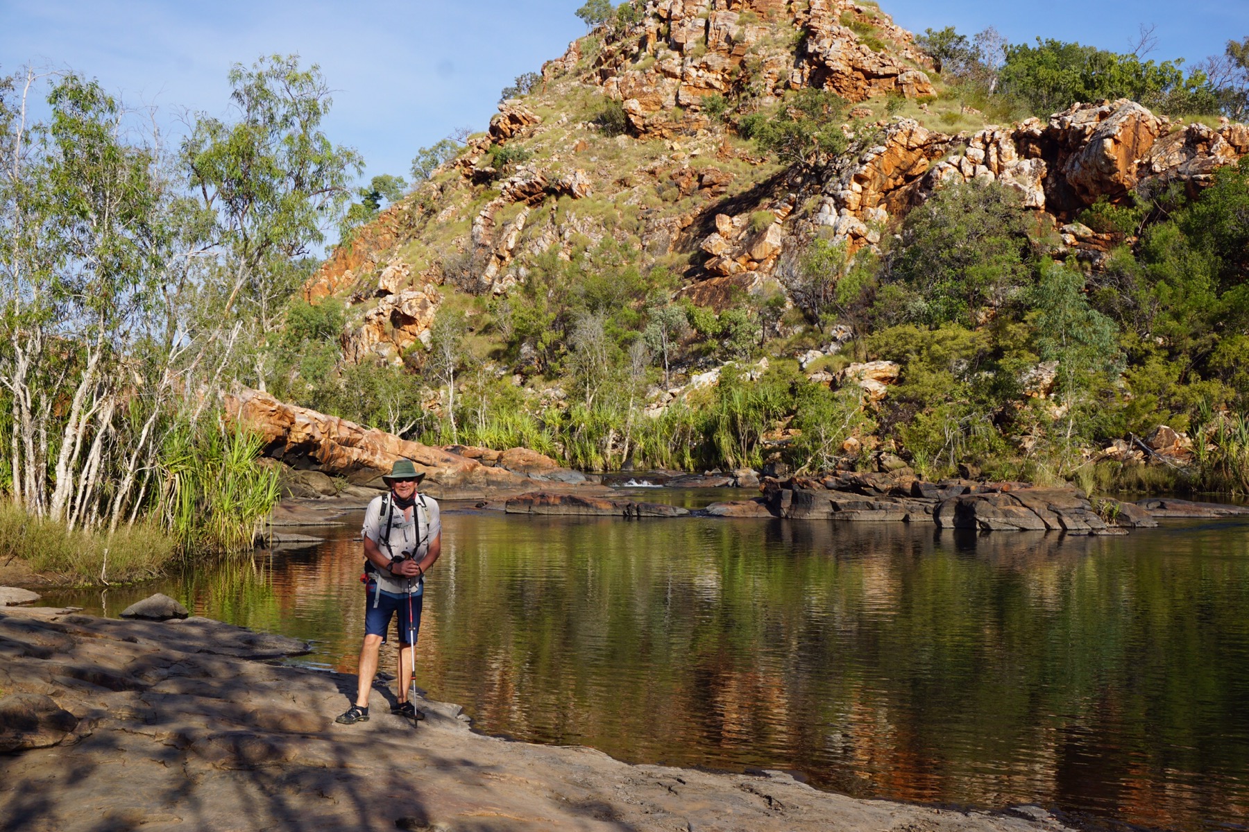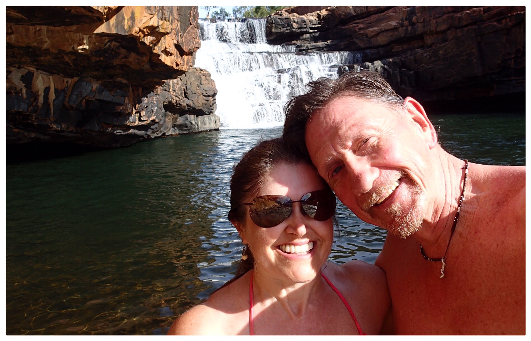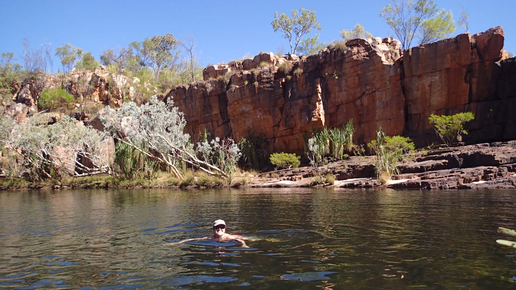We packed up this morning and tackled the 2 hour drive out of the Mornington Wilderness, reflecting on what a great experience it had been to stay there. A quick top up of diesel at the Imintji Road House, $2’s a litre (ouch – but cheaper than they last fill! Two apples and a pallett of strawberries were procured, as our first fresh veg we’ve seen for weeks), and we were soon pullling up at the Slient Grove campground. This was where we left the van and headed up the short track to Bell Gorge, a short walk/rock hop (Kimberley classic walking track) and a climb down to an amazing swimming hole complete with a perfect waterfall framing the view.