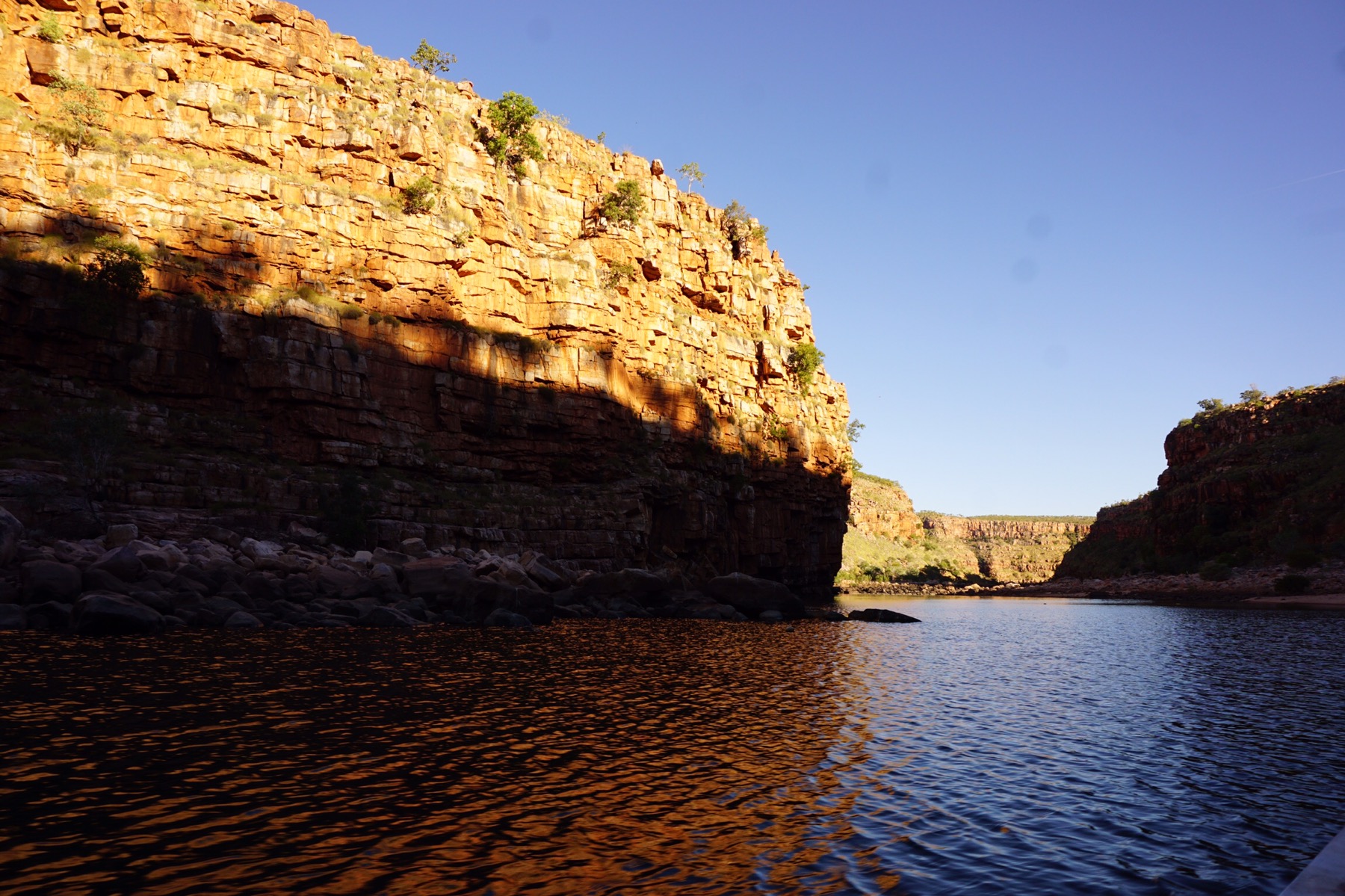 Reaching the end of the gorge we were handed some fish food pellets and told to hold our hands out over the boat…yes I’m getting to the being shot at by fish bit finally…and jets of water were fired at the pellets by angler fish. Massive cat fish circulated and barramundi were spotted as well. A few rock wallabies were bounding along the gorge walls, all in all a quintessential Kimberley afternoon.