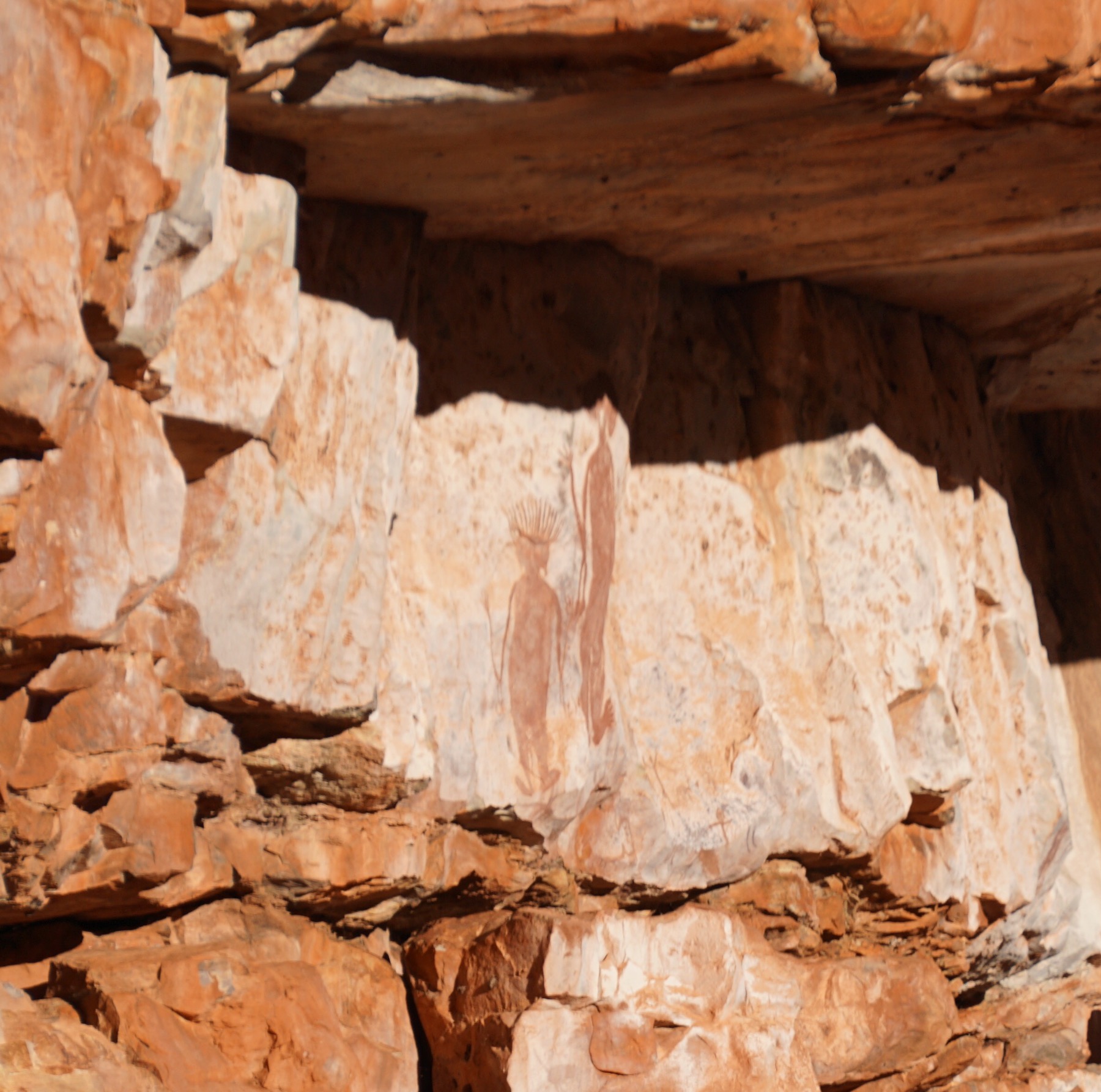 Before we left home for this trip I had started reading up about the history of the local art, especially the Gwion Gwion style (often called Bradshaw type, after the European who “discovered” it). It has been hotly argued over in terms of its age and origins. It is very unique in its depiction of human figures with very distinctive ornamental clothing, unlike anything else seen in this country. I asked the guide if there was anywhere I might see this type of art down the Gibb River Road. It’s often in very remote country on private property, but I had heard rumours there was some on El Questro land. He quietly said “look over my left shoulder”..and there it was up on a rock shelf. The property is in discussions with the local Aboriginal custodians to see if they can let visitors officially view it. I was really excited to have my first glimpse of this mysterious art that has fueled so much speculation about its original painters.